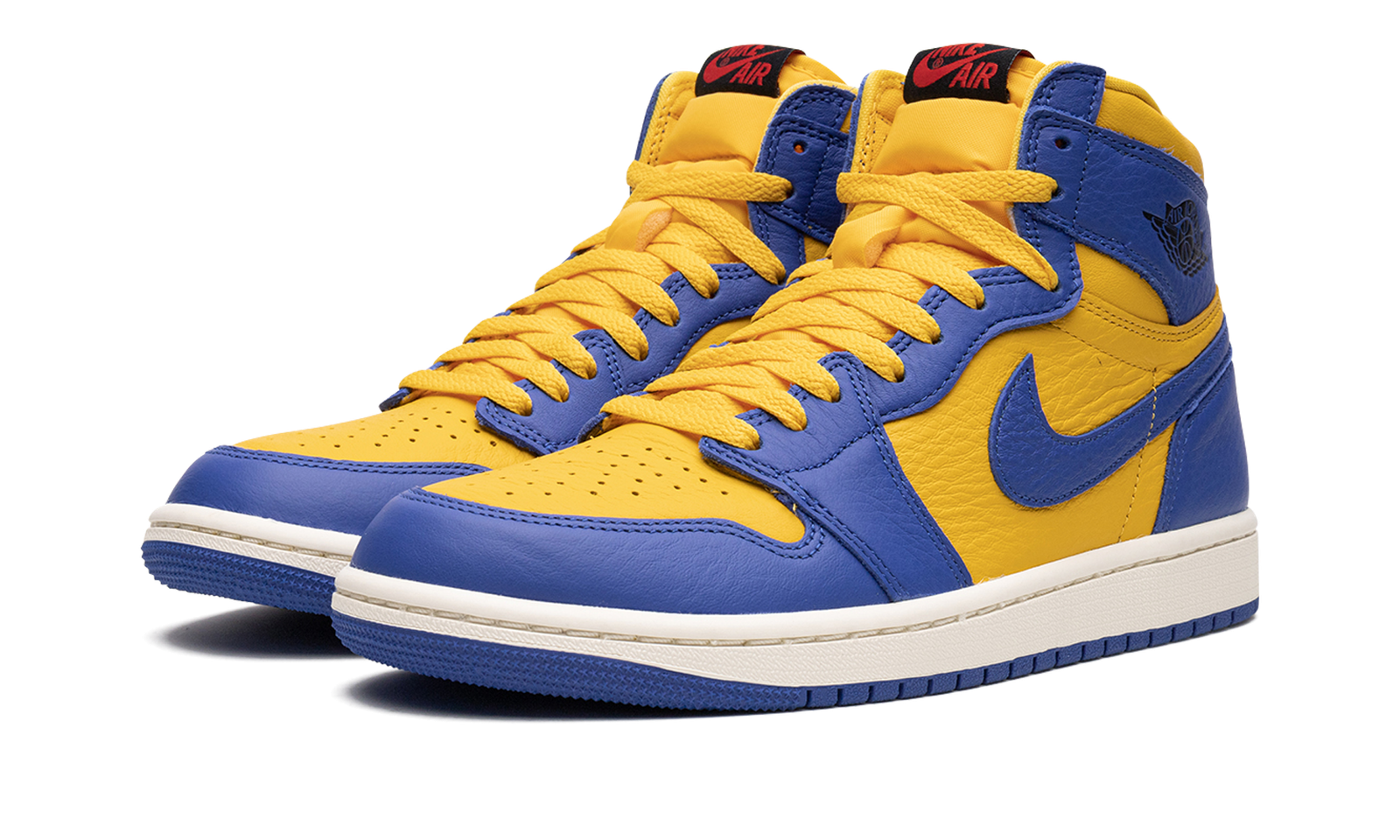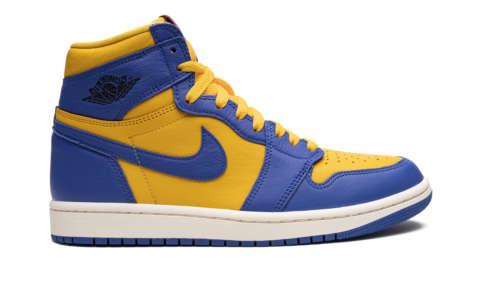The Women’s Air Jordan 1 High OG “Reverse Laney” is a women’s-exclusive colorway of Michael Jordan’s first signature shoe that flips the color block of a popular, non-original Air Jordan 1 colorway. The shoe in question is the Jordan 1’s “Laney” design, a release from 2013 that references the team uniform colors of Jordan’s high school basketball team. The shoe features a Varsity Maize leather base with contrasting Game Royal leather overlays and Swoosh branding. A classic “Wings” logo appears on the collar and red “Nike Air” detailing is found on the tongue. The shoe’s white rubber midsole and blue outsole complete its design. Release date: February 17, 2023
