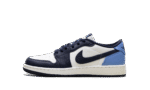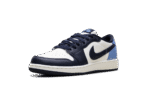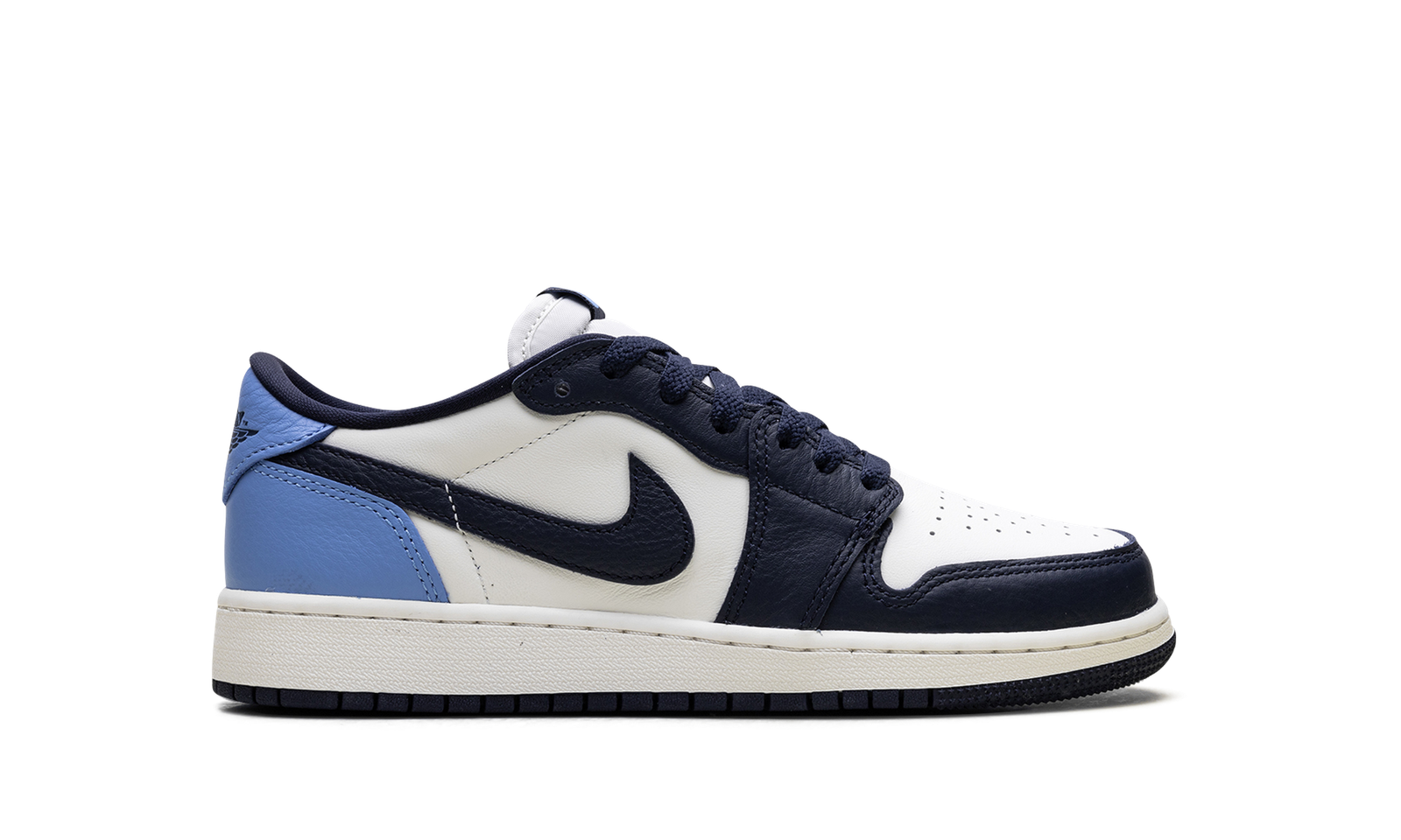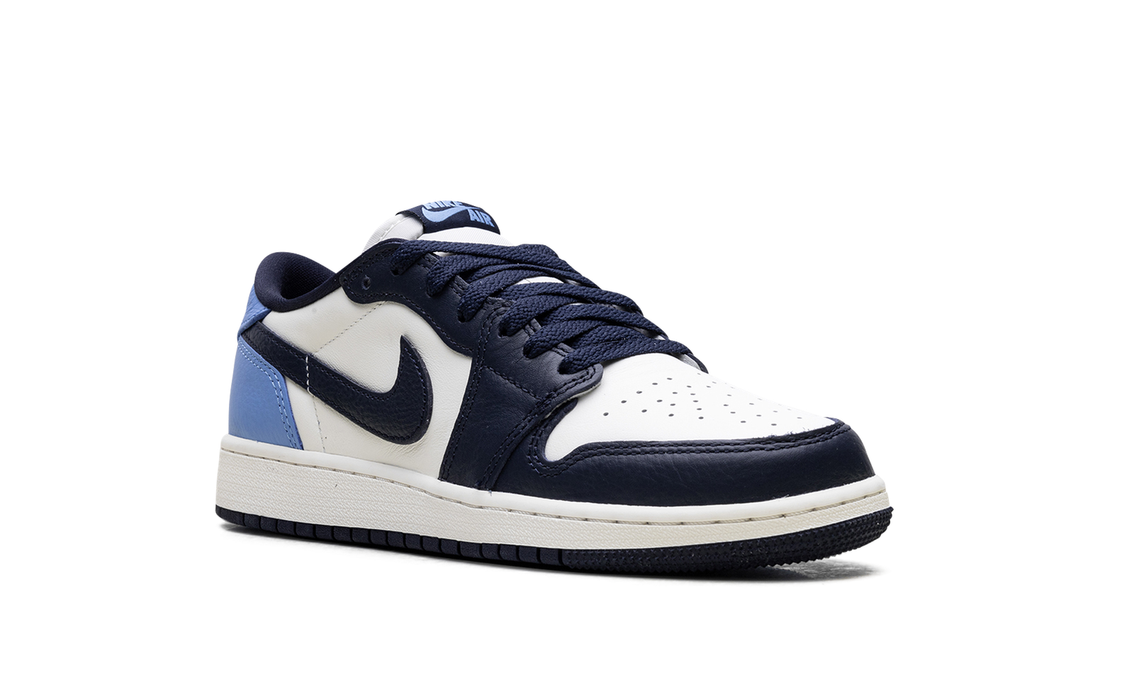 The Air Jordan 1 Low GS “Obisidian” is the grade school version of the 2025 lowtop. The kids’ AJ1 Low OG “Obisidian” has a leather upper that combines shades of navy and light blue with off-white. The lowtop Jordan 1 has a Wings logo on the heel and a navy Swoosh.