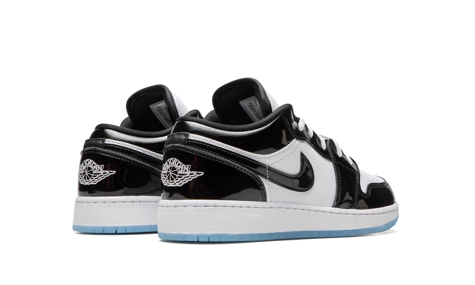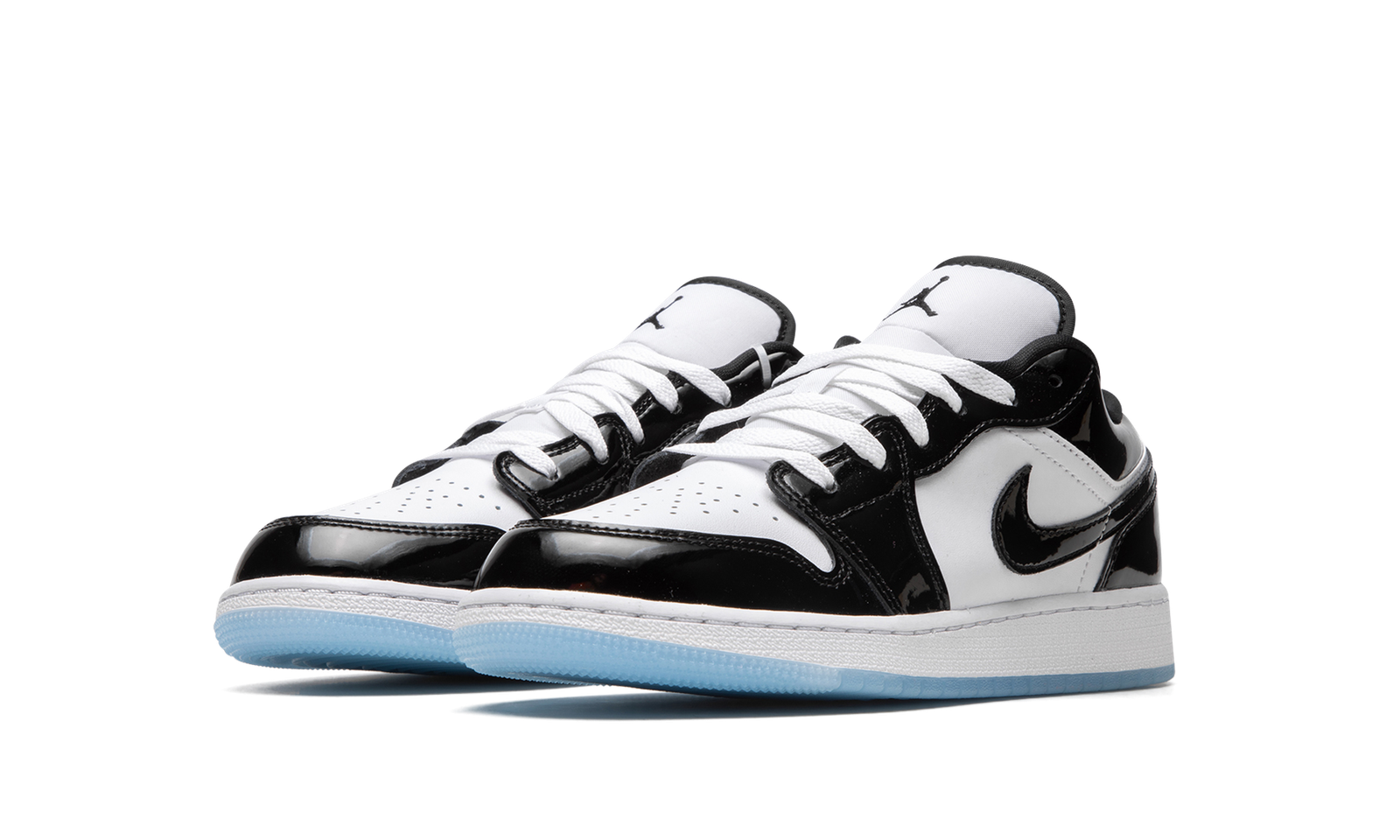 The Air Jordan 1 Low SE GS “Concord” is the youth sizing of the popular low-top sneaker that draws inspiration from the Air Jordan 11’s original colorway. Based on the iconic “Concord” Jordan 11, the Jordan 1 Low SE GS features a white leather base with contrasting black patent leather overlays and Swoosh branding. White “Wings” detailing is embroidered on the back of the shoe. A black Jumpman is found on the white nylon tongue. Underfoot, the icy blue translucent outsole is a nod to the design of the Jordan 11’s “Concord” colorway.