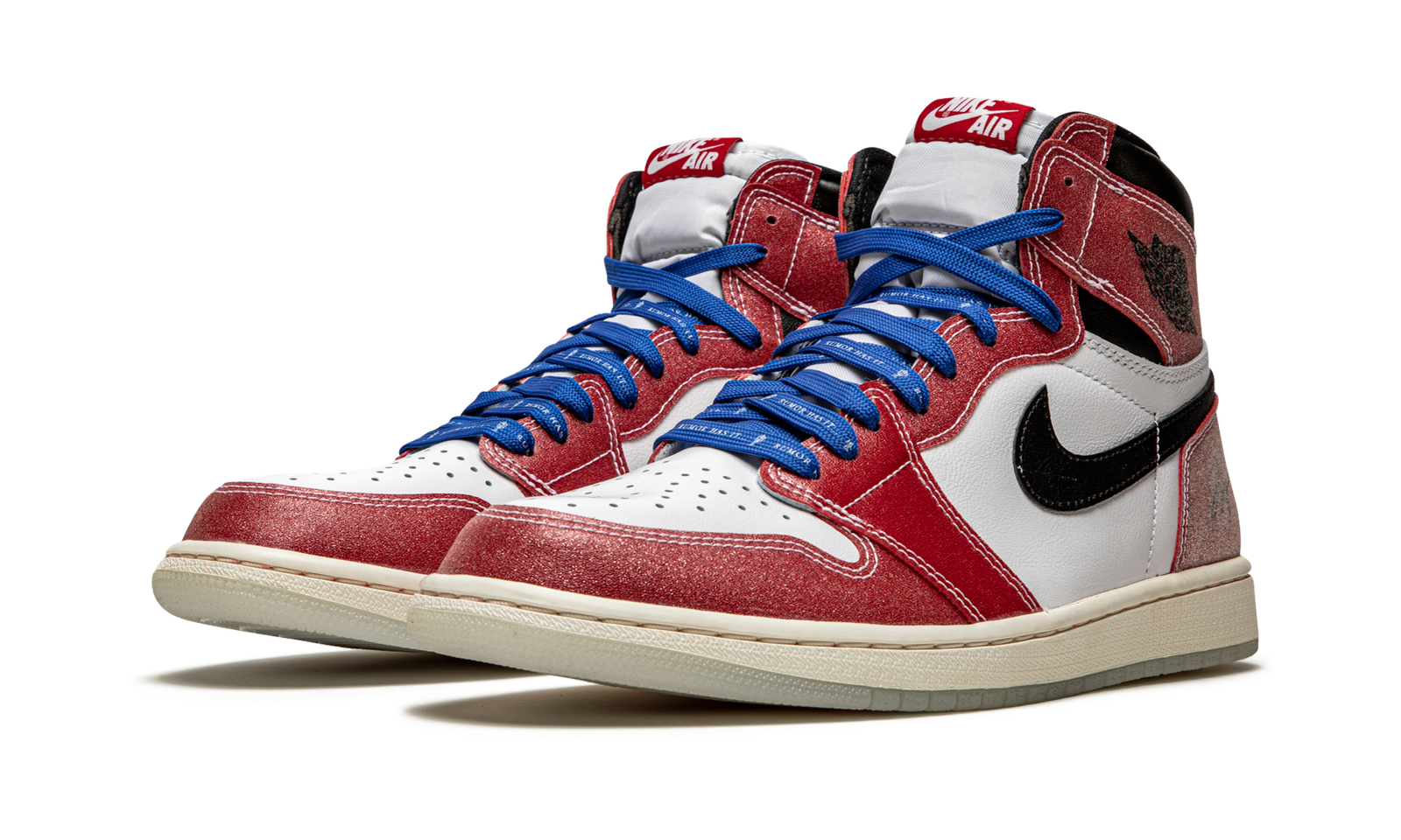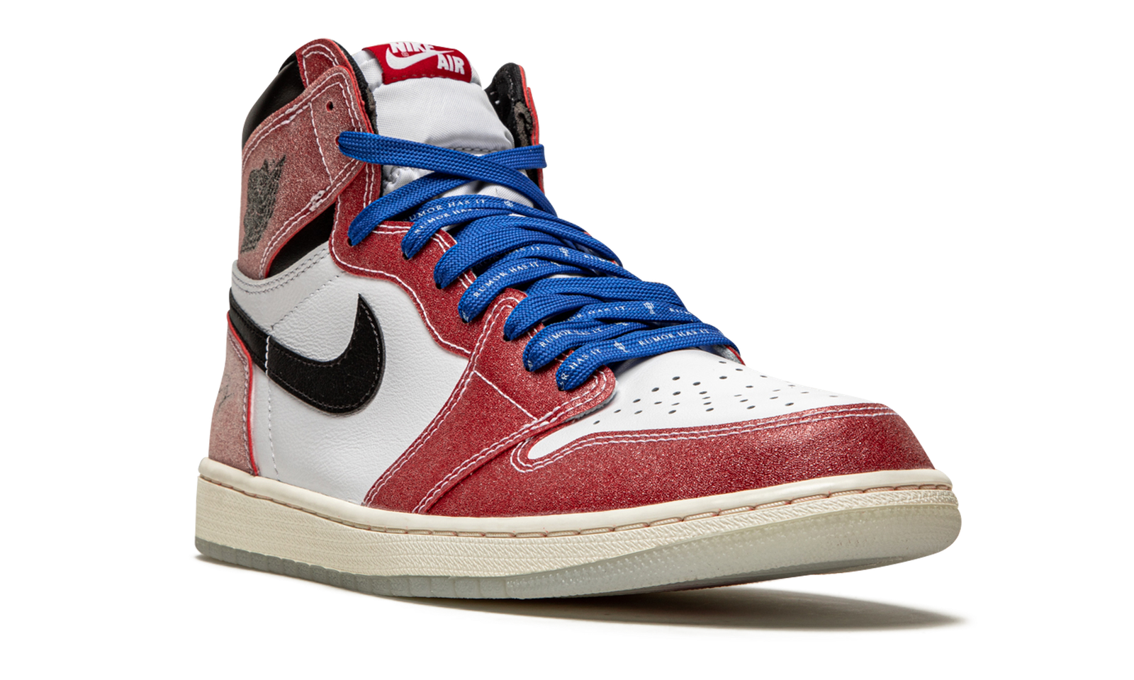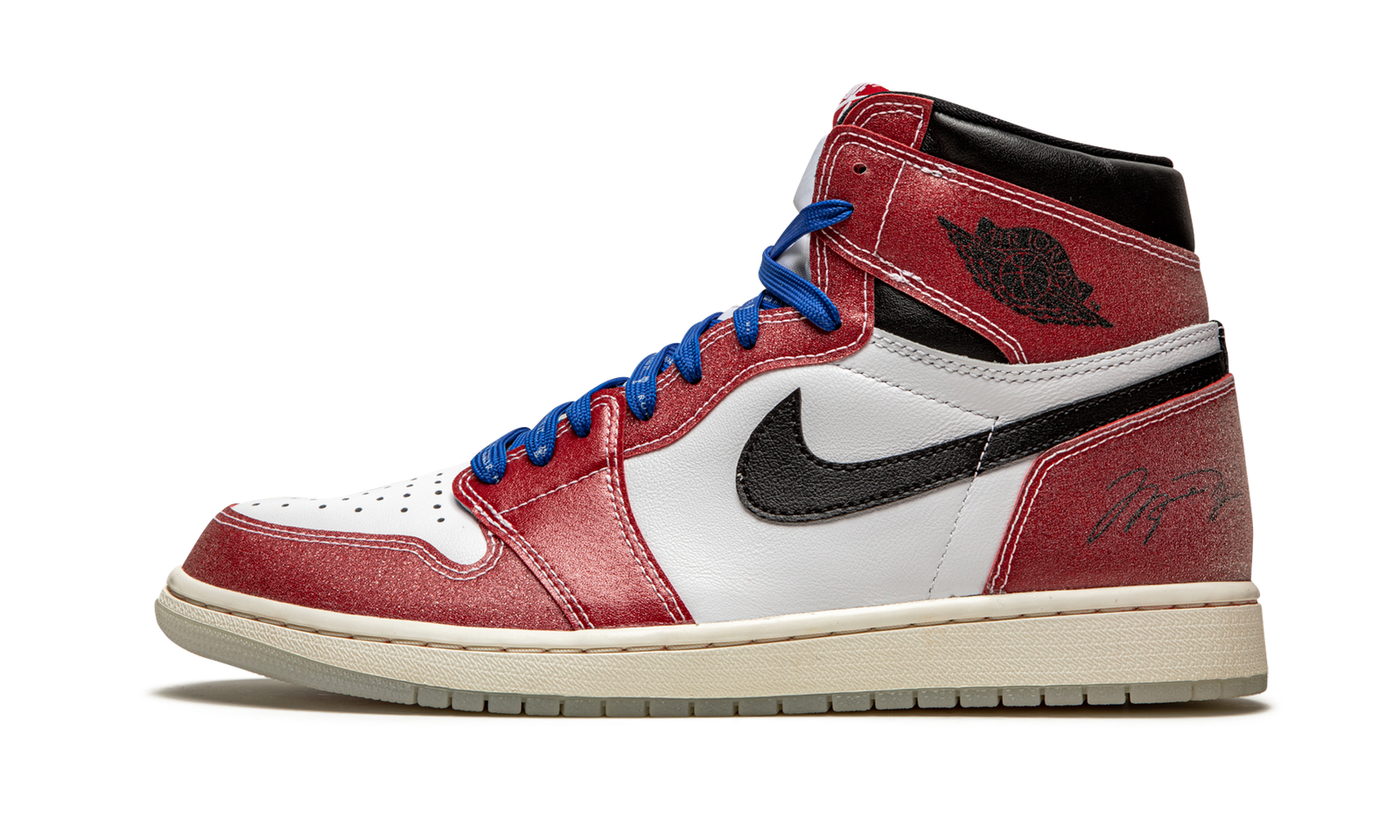 The Trophy Room x Air Jordan 1 High “Chicago” is a desirable collaboration between Marcus Jordan’s sneaker boutique and Jordan Brand on Michael Jordan’s first signature shoe. This version of Trophy Room’s “Freeze Out” colorway includes alternate blue laces that were packaged only with friends and family pairs gifted by Trophy Room. Pairs sold via Nike SNKRS and elsewhere did not include blue laces. The colorway suggests that Michael was indeed “frozen out” of the 1985 NBA All-Star Game by his future Basketball Hall of Fame teammates. Several subtle nods to the “freeze out” appear on the shoe, beginning with the icy texture covering the red leather overlays found on the forefoot, eyelets, collar, and heel. Elsewhere, white leather appears on the perforated toe and on the mid-panel. Black shoelaces sit atop the white nylon tongue that features a red nylon tongue tag with “Nike Air” branding. A black leather Swoosh is located on either side and a black “Wings” emblem can be found on the collar. Michael Jordan’s signature is printed onto the heel above the sail midsole. The translucent blue outsole dons blue and red stars to finish off the look. Release date: February 10, 2021.