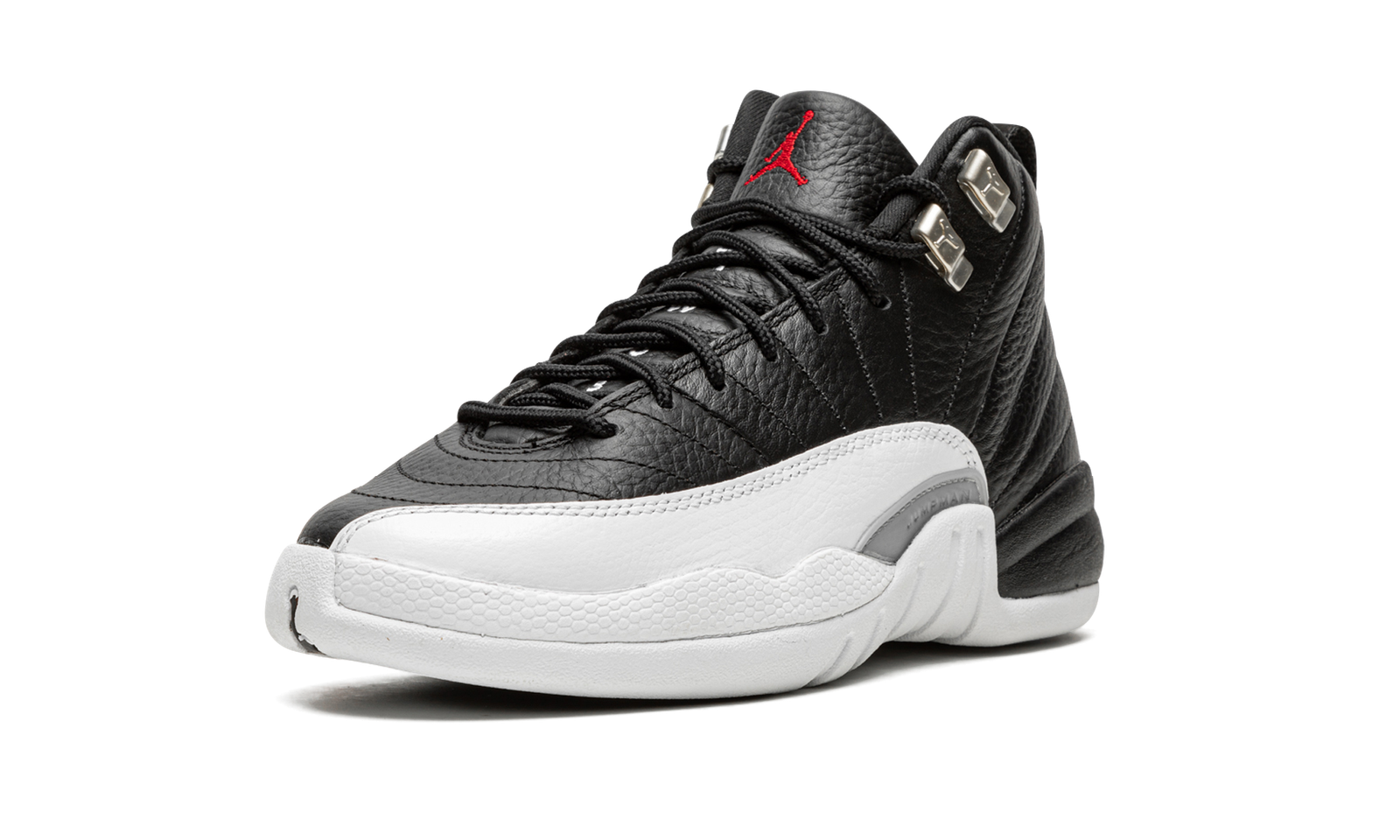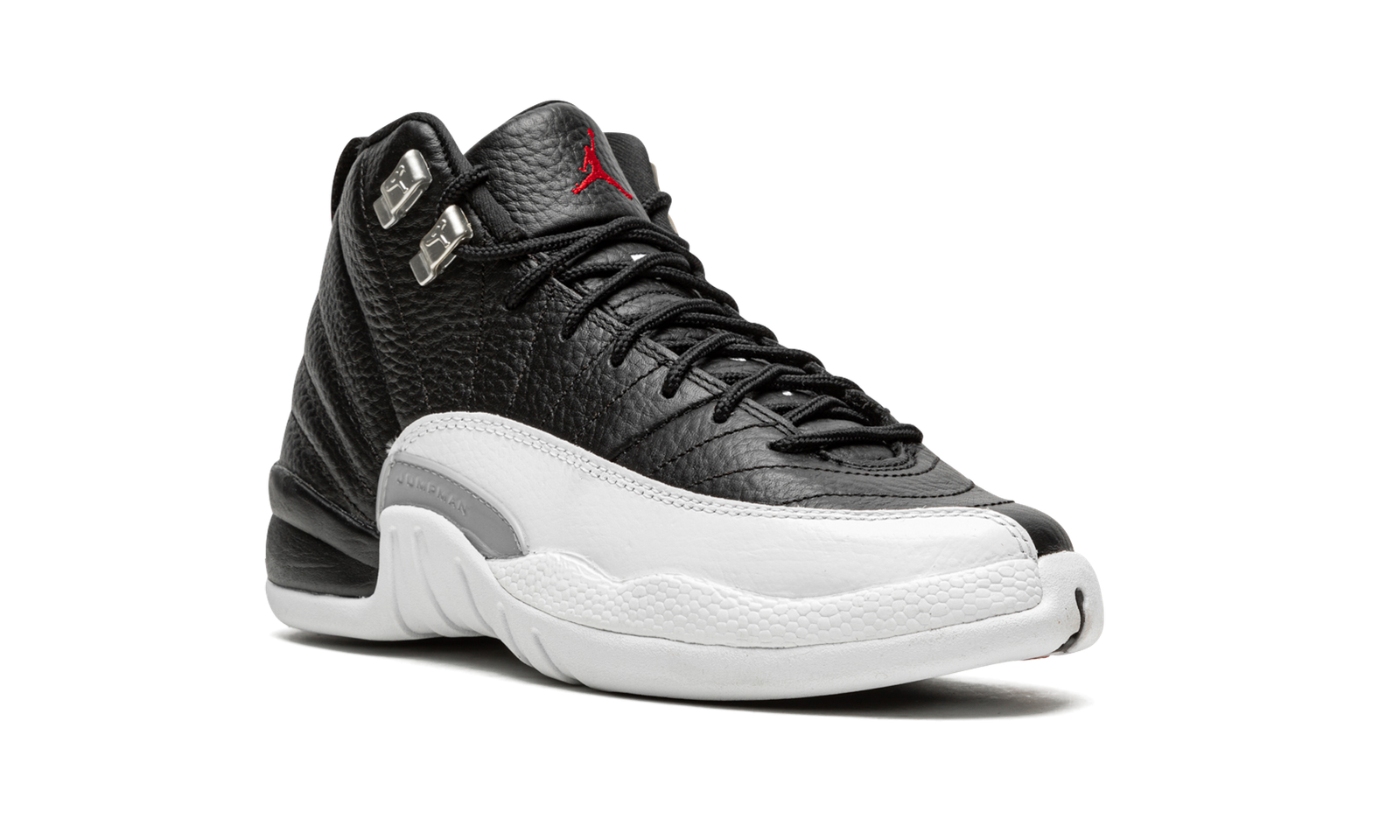 The Air Jordan 12 GS “Playoffs 2022” is the youth sizing of the February 2022 release of an original colorway of the vintage basketball shoe that Michael Jordan wore during the 1997 NBA Playoffs. From Jordan Brand’s All-Star Weekend 2022 release cycle, the Jordan 12 “Playoffs” celebrates the shoe’s 25-year anniversary in spectacular fashion, as the modern incarnation of the shoe is identical to the original version from ‘97. The shoe is complete with a black leather upper with contrasting Metallic Silver eyelets. Textured white leather is found on the toe, mudguard, and midsole. A silver “Jumpman” plate appears on the branding plate on the lateral side of the shoe. The black leather tongue displays a red embroidered Jumpman and “Two3” branding. Red “23” and “Jordan” branding can be found on the back of the black rubber midsole and heel, respectively. Release date: February 19, 2022