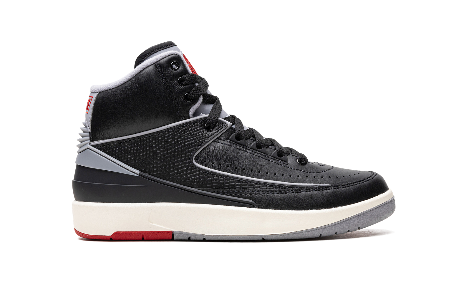 The Air Jordan 2 Retro GS “Black Cement” is the youth sizing of the colorway of Michael Jordan’s second signature shoe inspired by a classic Air Jordan design. The shoe we’re referring to is the Air Jordan 3 “Black Cement,” one of the most iconic sneakers of all time. Here, the “Black Cement” Jordan 2 mimics the Jordan 3 of the same nickname’s look with black, grey, and red detailing. More specifically, the shoe has a black leather construction with contrasting Cement Grey accents on the heel, tongue, and inner lining. A red “Wings” logo appears on the tongue. Underfoot, the white midsole is paired with a red and grey rubber outsole. Release date: September 23, 2023
