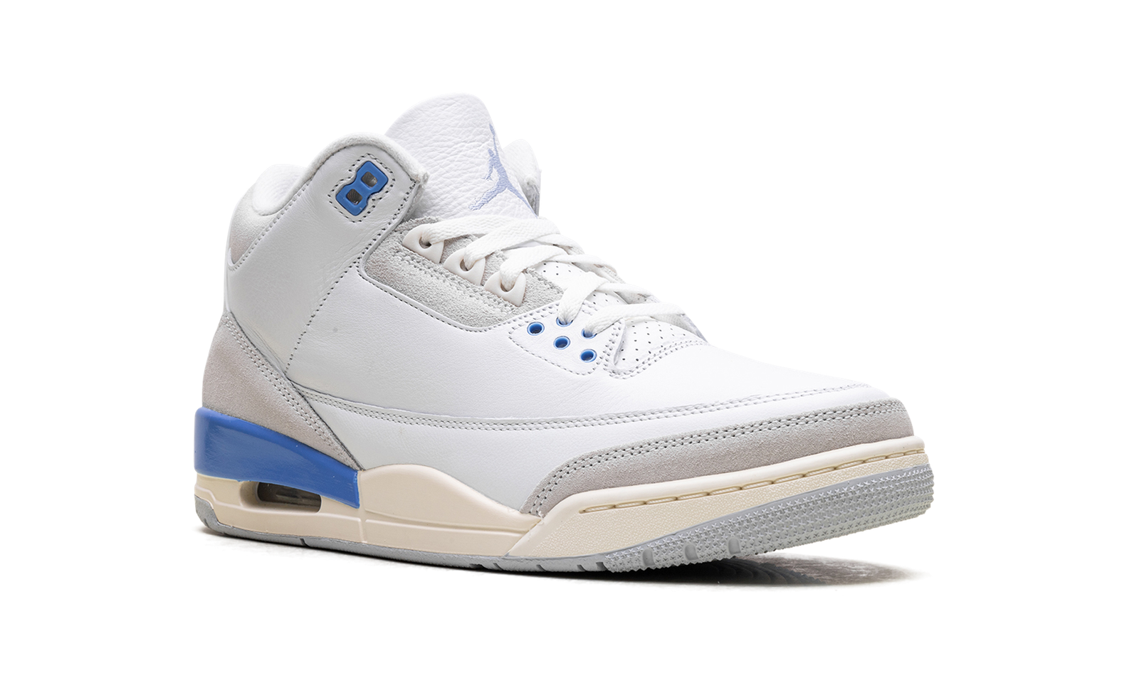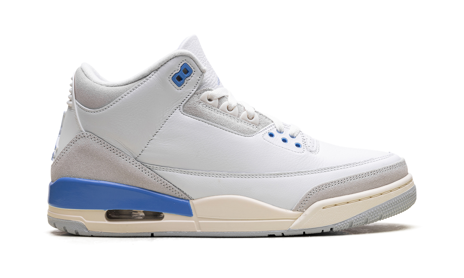 The Air Jordan 3 “Lucky Shorts” is a blue and white colorway of Michael Jordan’s third signature shoe. The “Lucky Shorts” AJ3 takes inspiration from a pair of UNC shorts that Jordan wore underneath his NBA uniform during his carer. The upper on this Jordan 3 mixes white leather with off-white suede and adds Carolina blue accents throughout.