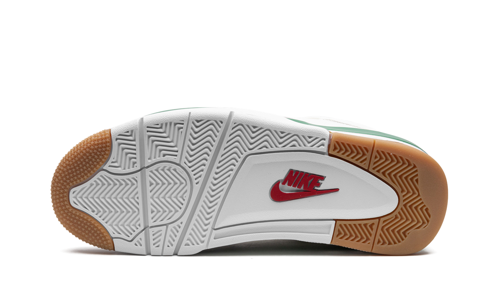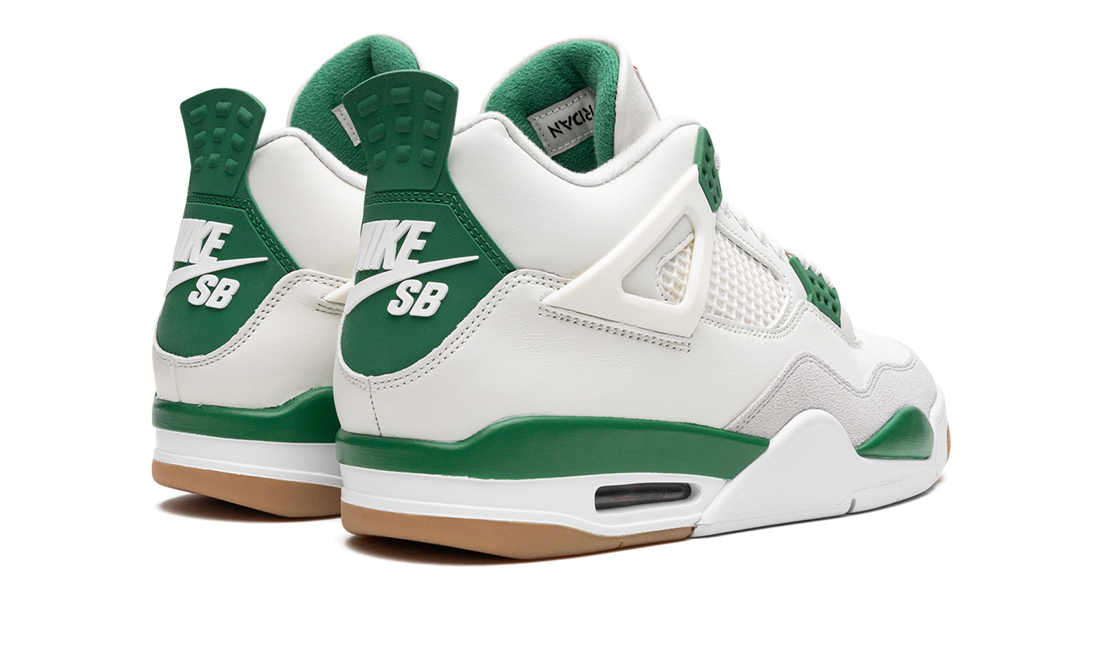 The Air Jordan 4 SB “Pine Green” is an alternate version of the retro basketball shoe that’s updated with a performance skateboarding focus. A collaboration between Nike SB and Jordan Brand on Michael Jordan’s fourth signature shoe, the Jordan 4 SB is designed in a smooth white leather upper with a light grey suede overlay on the toe and forefoot. Contrasting Pine Green detailing appears on the heel counter with “Nike SB” branding and on the plastic eyelets. Tonal mesh is found on the mid-panel and tongue. A red Jumpman is located on the tongue. Release date: March 20, 2023