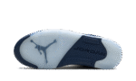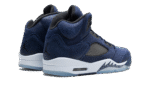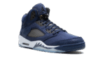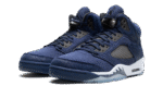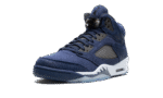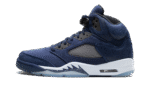 The Air Jordan 5 “Midnight Navy” is a colorway of the retro basketball shoe loosely inspired by the Georgetown Hoyas college basketball team. While not affiliated with the Hoyas, the “Midnight Navy” updates Michael Jordan’s fifth signature shoe with a dark navy blue textile upper with suede on the heel, collar, and toe panels. Smoky translucent netting appears on the side and tongue. A black Jumpman is embroidered on the heel and textile tongue. Navy shark tooth detailing with white speckling on the light grey midsole sits above the solid navy and translucent outsole. Release date: November 10, 2023