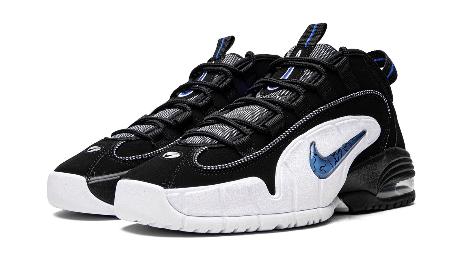 The Nike Air Max Penny 1 “Orlando” is the 2022 reissue of Anfernee “Penny” Hardaway’s first signature shoe with Nike. A classic performance basketball shoe from Nike’s 1990s catalog, the Air Max Penny 1 was worn by Penny with the Orlando Magic during the 1995-96 NBA season. The modern “Orlando” colorway from 2022 is nearly identical to the version Penny wore in the NBA. The upper features a black synthetic nubuck base with white detailing on the lateral side “wing” panels. Penny’s signature “1-Cent” branding is found on the heel, and royal blue jewel Swooshes lay within the lateral side wings. A visible Air unit appears in the heel of the midsole to complete the celebrated sneaker. Release date: August 11, 2022