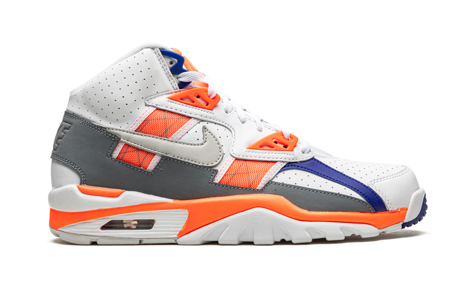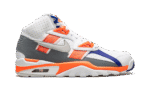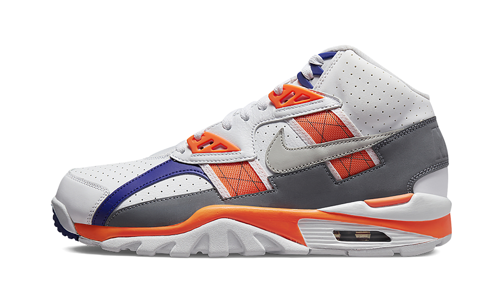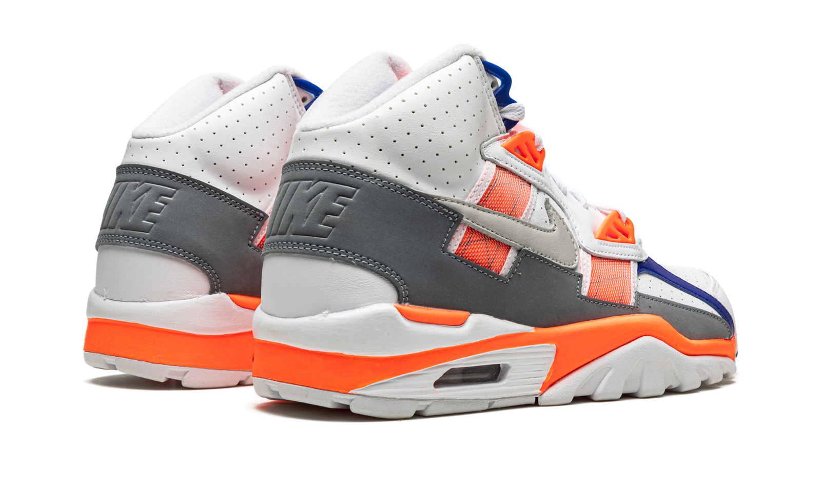 The Nike Air Trainer SC High “Auburn” is a classic colorway of Bo Jackson’s former signature training shoe. Dressed in a blue, orange, and white color scheme, the “Auburn” Air Trainer SC High honors Bo’s alma mater, Auburn University, where he starred on the school’s football team from 1982 to 1985. Bo famously wore the performance shoe in memorable Nike advertisements in the early 1990s. The modern “Auburn” stays true to the original’s design, as it features a perforated white leather upper with a blue leather overlay on the forefoot. Orange nylon straps with contrast criss-cross blue stitching anchor the eyelet panel. A grey synthetic material appears on the mudguard. A light grey felt Swoosh is found on both sides of the shoe, and debossed “NIKE” detailing appears on the heel counter. An orange overlay appears above the visible Air unit in the heel of the midsole.