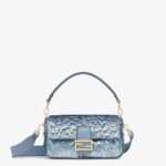 Hand-embroidered with light blue sequins of different shapes and sizes with a denim-effect finish. Trimmed in light blue calfskin and embellished with an FF clasp.