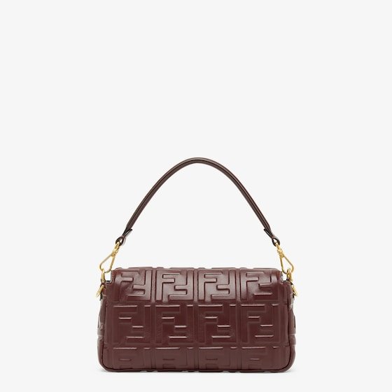 Iconic medium Baguette bag, part of the collection curated with designer Stefano Pilati, made of burgundy soft nappa leather with a three-dimensional texture embossed FF motif. Decorated with an FF clasp.