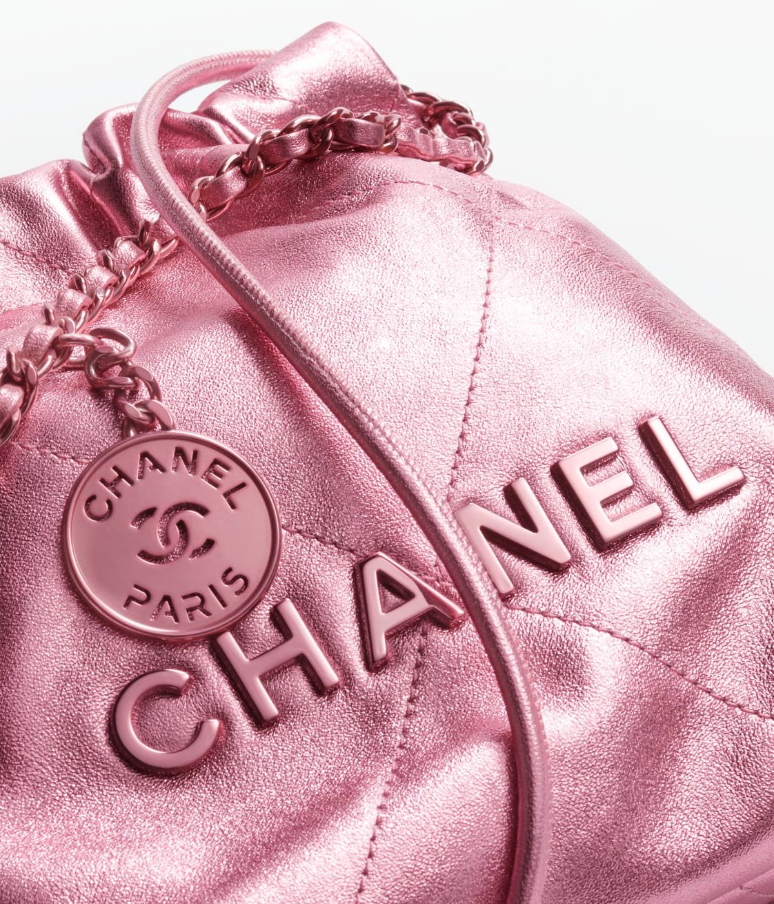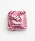 The Chanel Mini 22 Hobo Bag is crafted from pink metallic calfskin with pink hardware and signature diamond quilting, a pink lacquered metal ‘Chanel’ signature on the front, a Chanel Paris metal hangtag, pink metallic leather interlaced chain links, a long leather cord and a long chain link shoulder strap.
