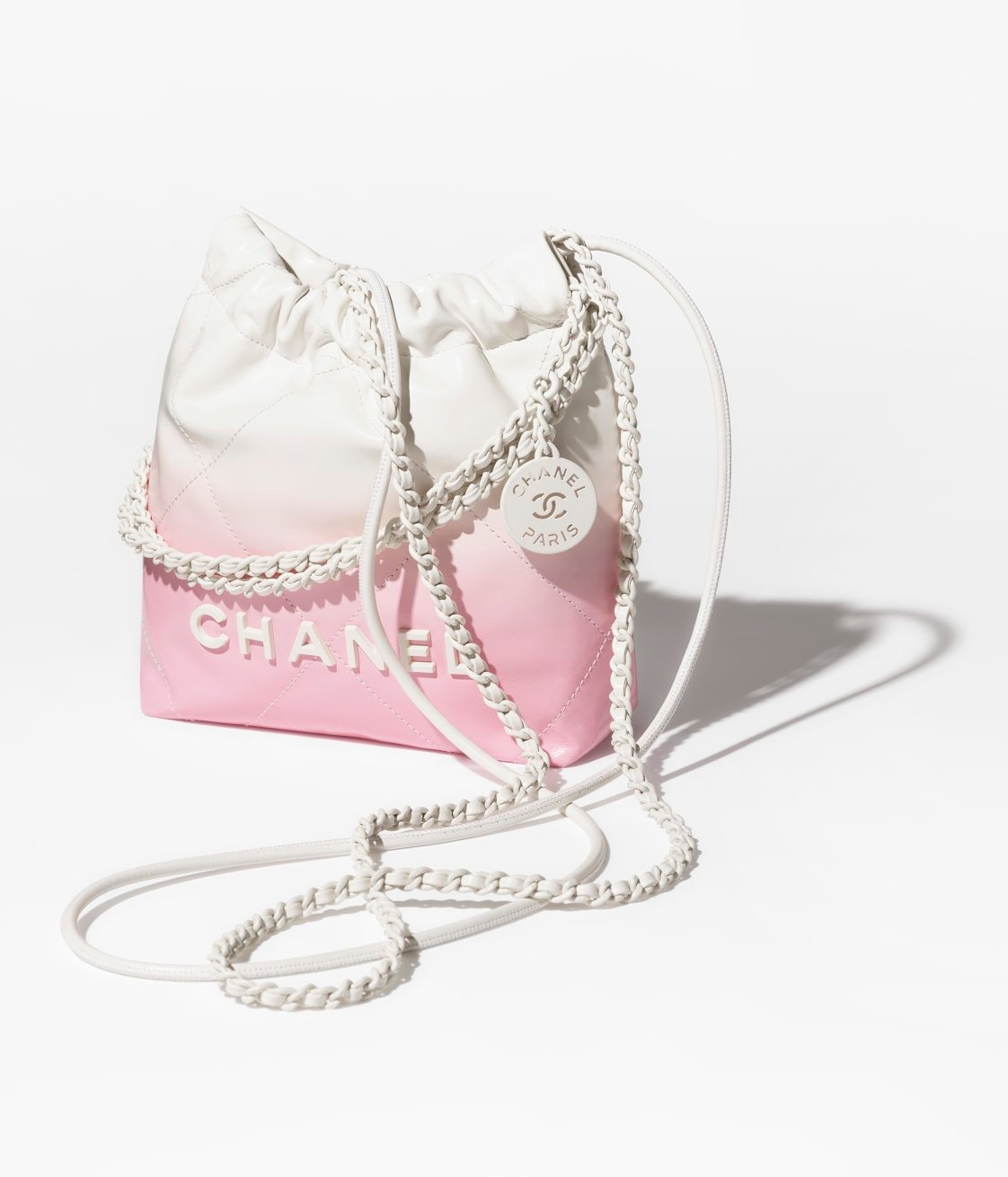 This Chanel Mini 22 Hobo bag is made of white and light pink gradient metallic calfskin with white hardware and signature diamond quilting, white lacquered metal “Chanel” logo on the front, Chanel Paris metal hangtag, white metal and white leather interlaced chain links, long leather cord and long chain link shoulder strap.