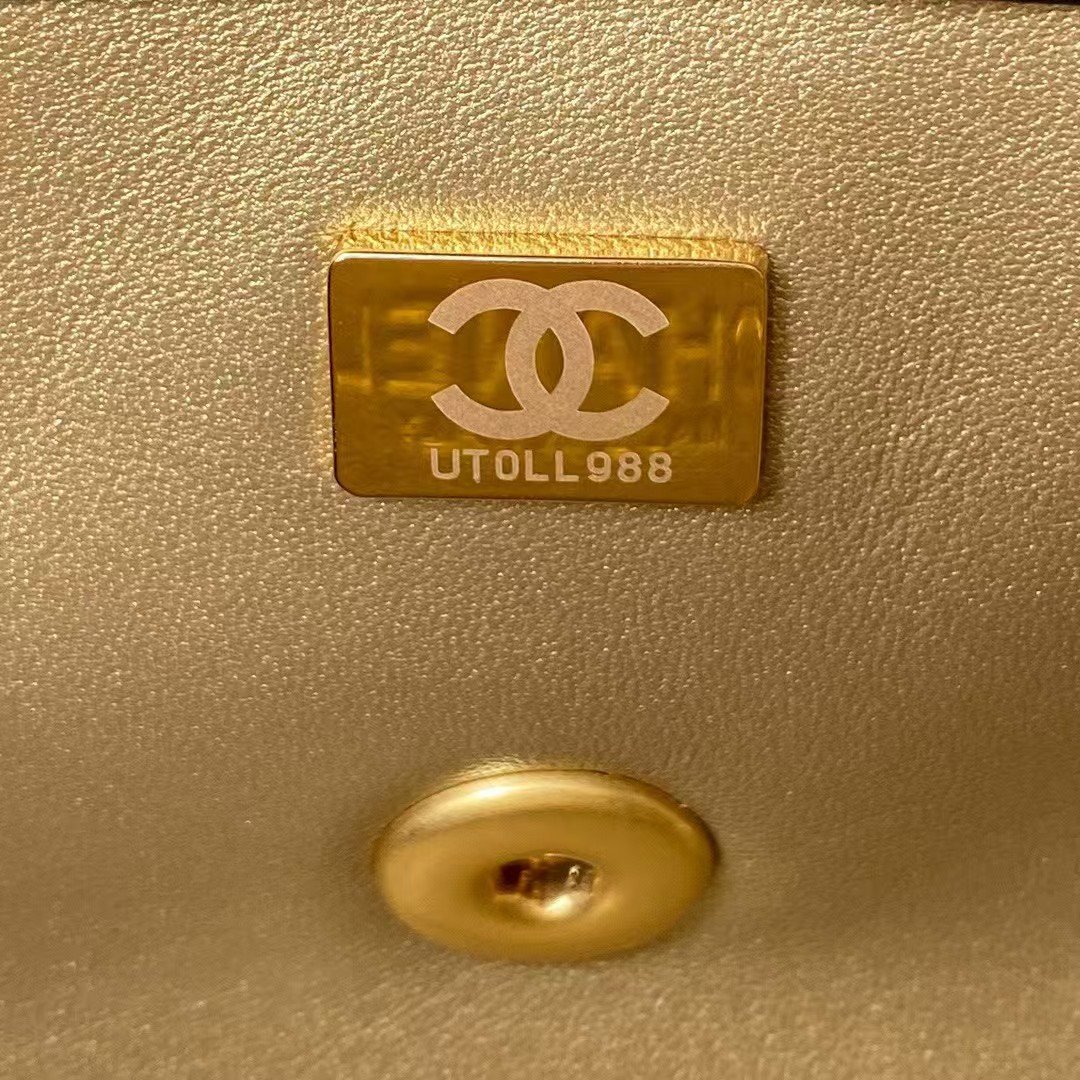 The interior is lined with metallic gold leather and features a zippered pocket with Chanel zipper and an open pocket underneath.
