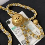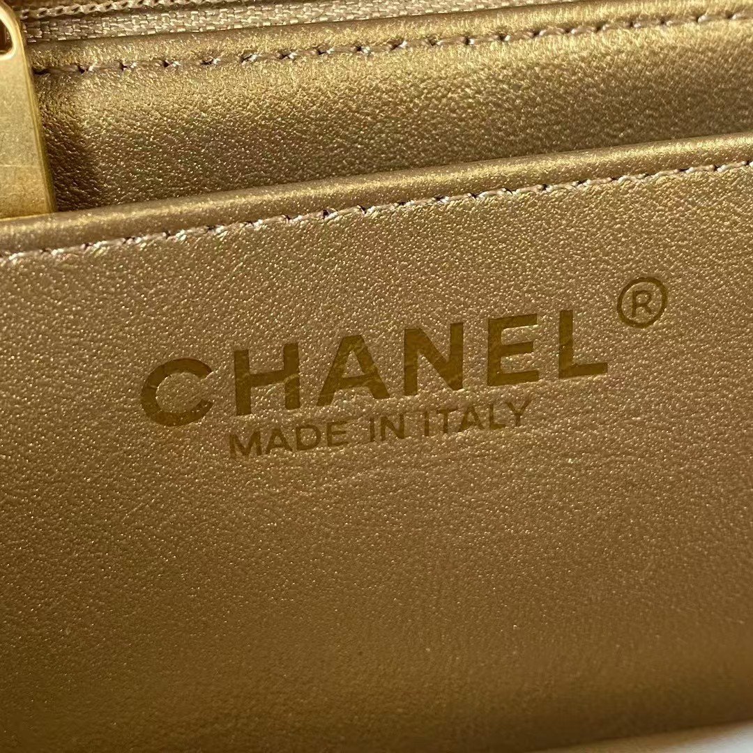 The interior is lined with metallic gold leather and features a zippered pocket with Chanel zipper and an open pocket underneath.