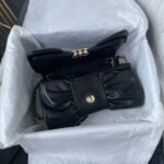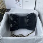 This Chanel Mini Bow Crossbody Bag is made of black shiny lambskin with light gold hardware, lambskin bow shape, signature CC logo with light gold hardware, buckle closure, black leather and light gold chain interwoven shoulder/crossbody strap.