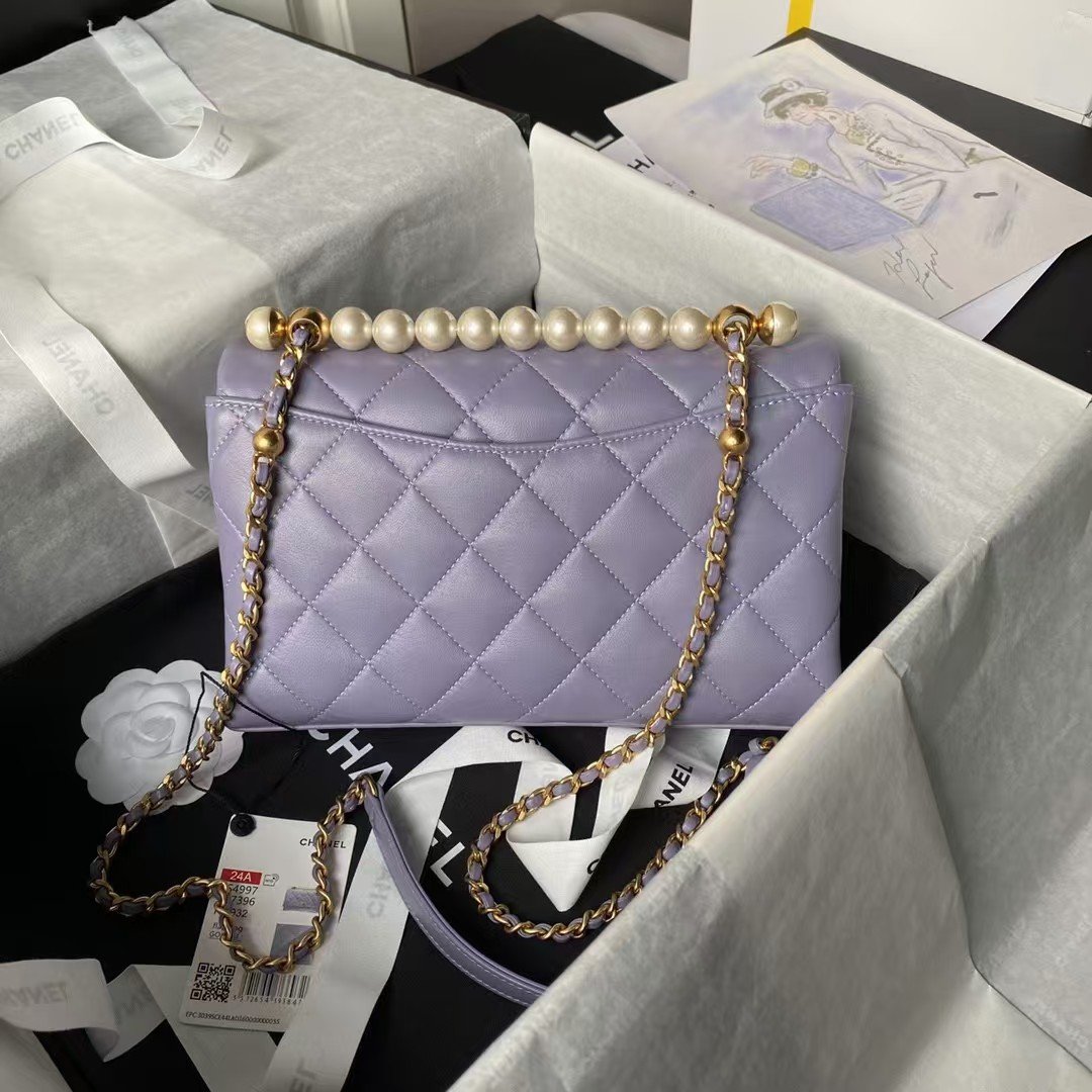 Chanel AS4997 Flap Bag With Top Handle Shiny Lambskin Imitation Pearls & Gold-Tone Metal Purple