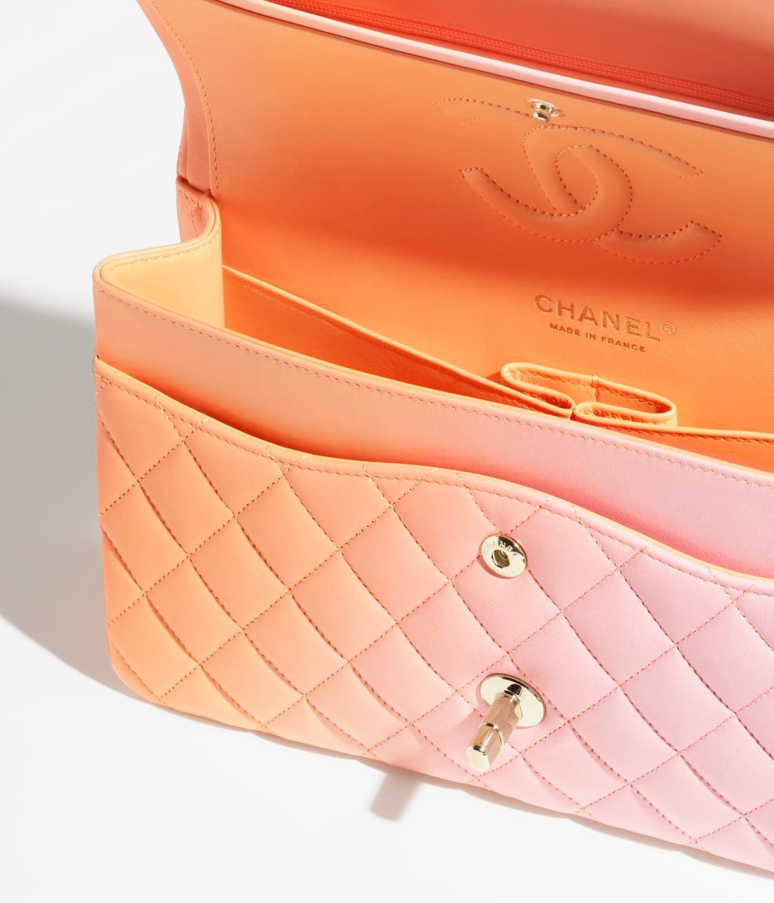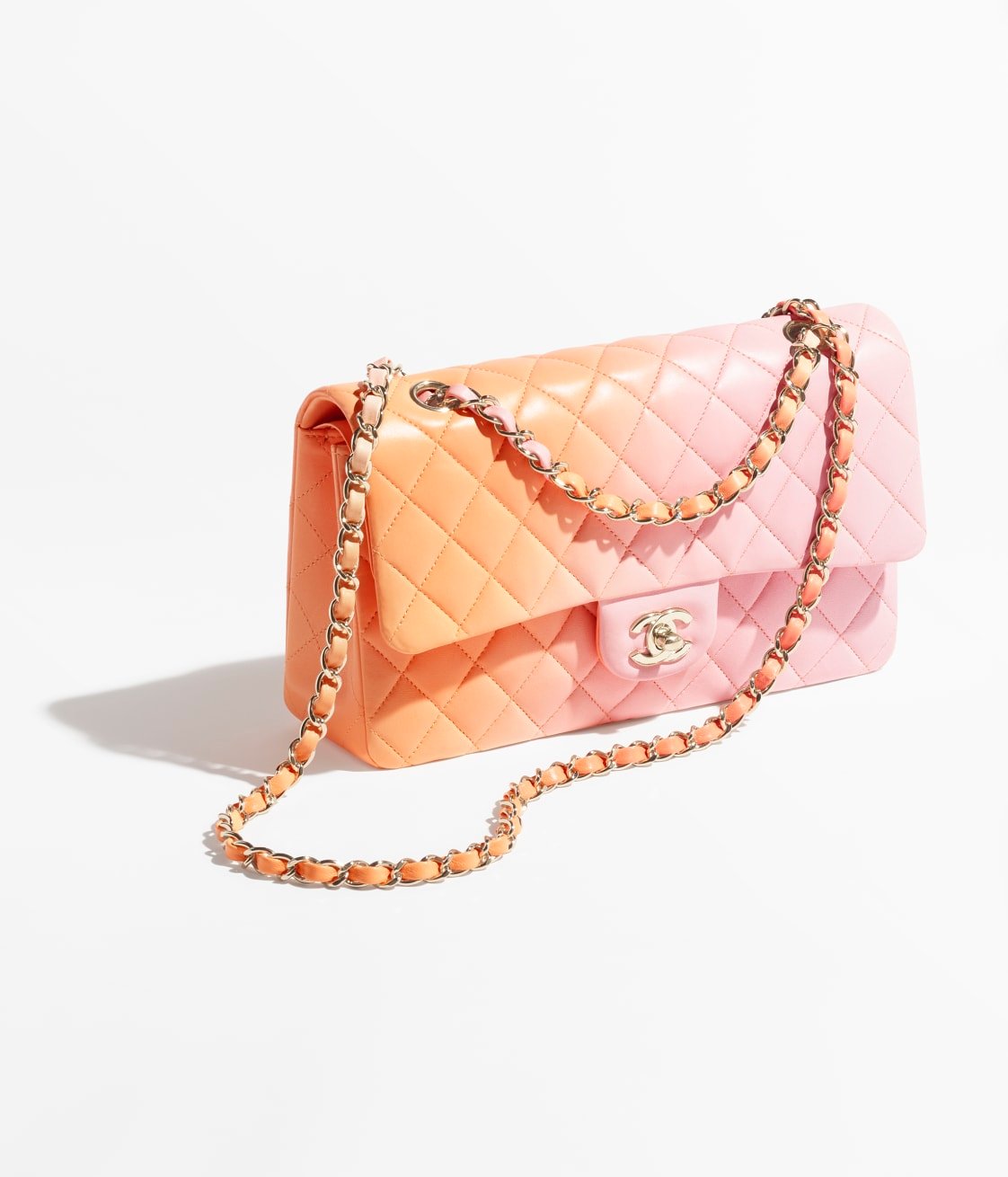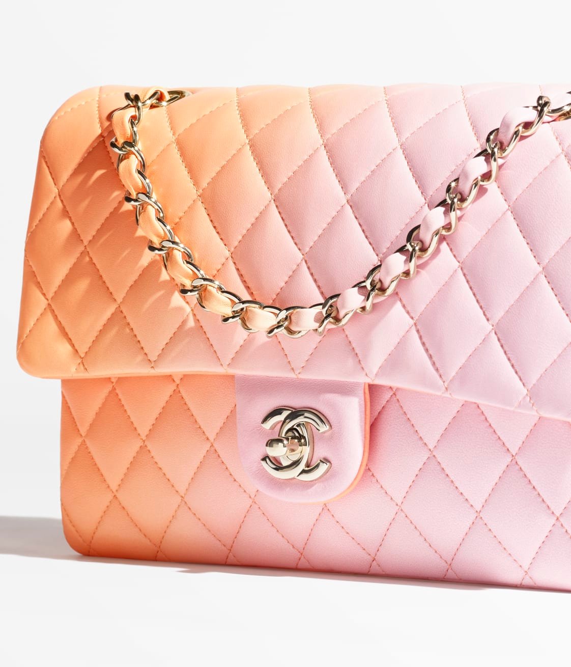 This classic double flap bag is crafted from pink iridescent lambskin with silver hardware, featuring the signature CC turnlock closure on the front flap, half-moon back pockets, adjustable silver interwoven chain links and a pink leather shoulder strap.