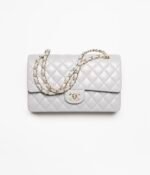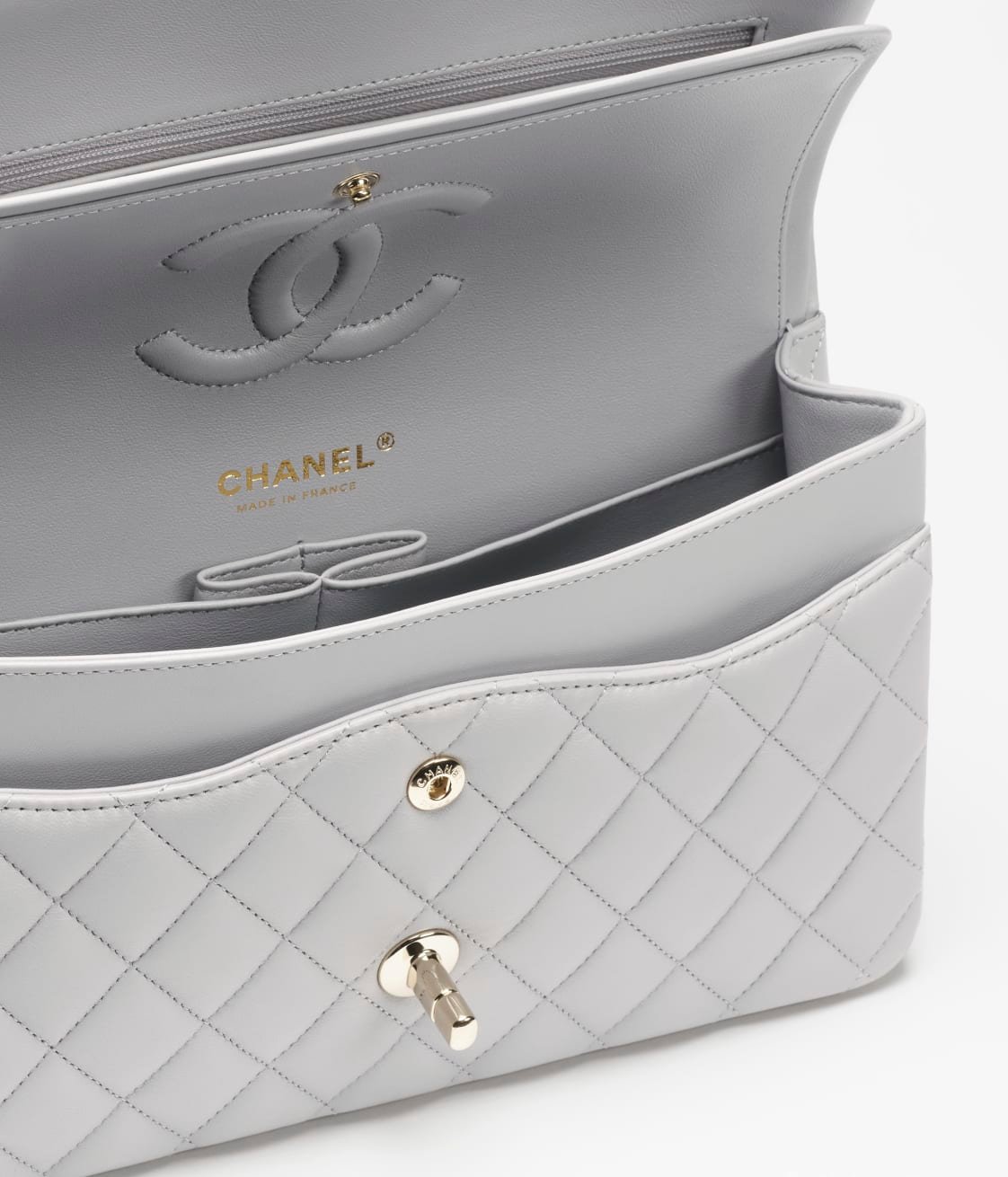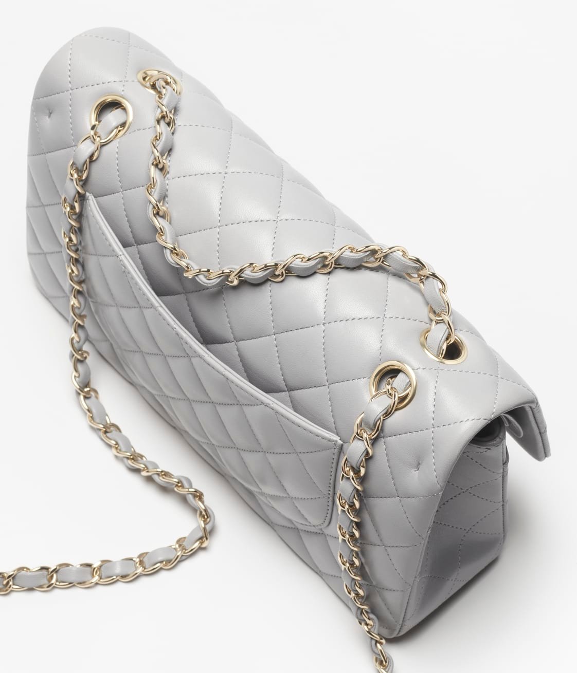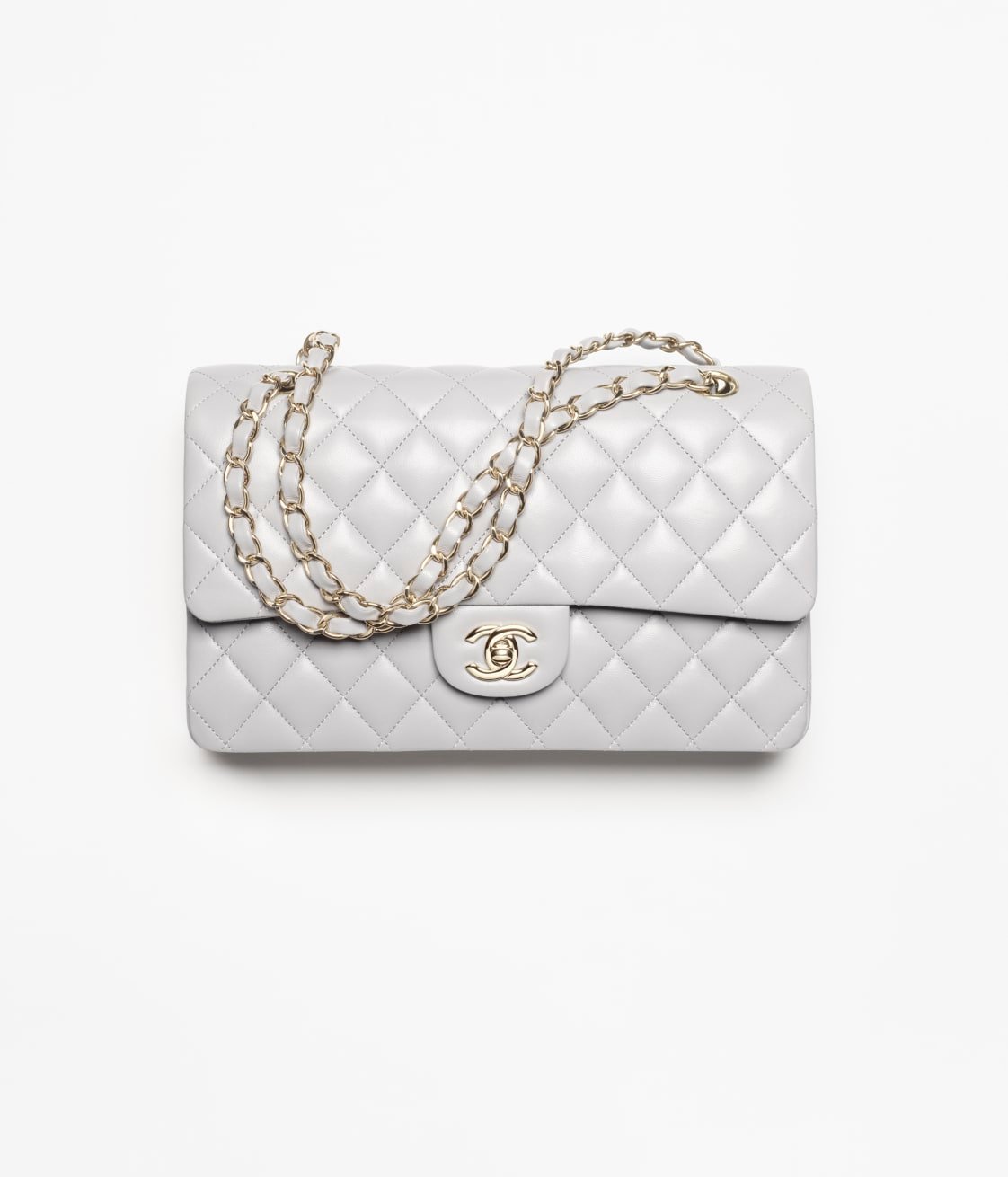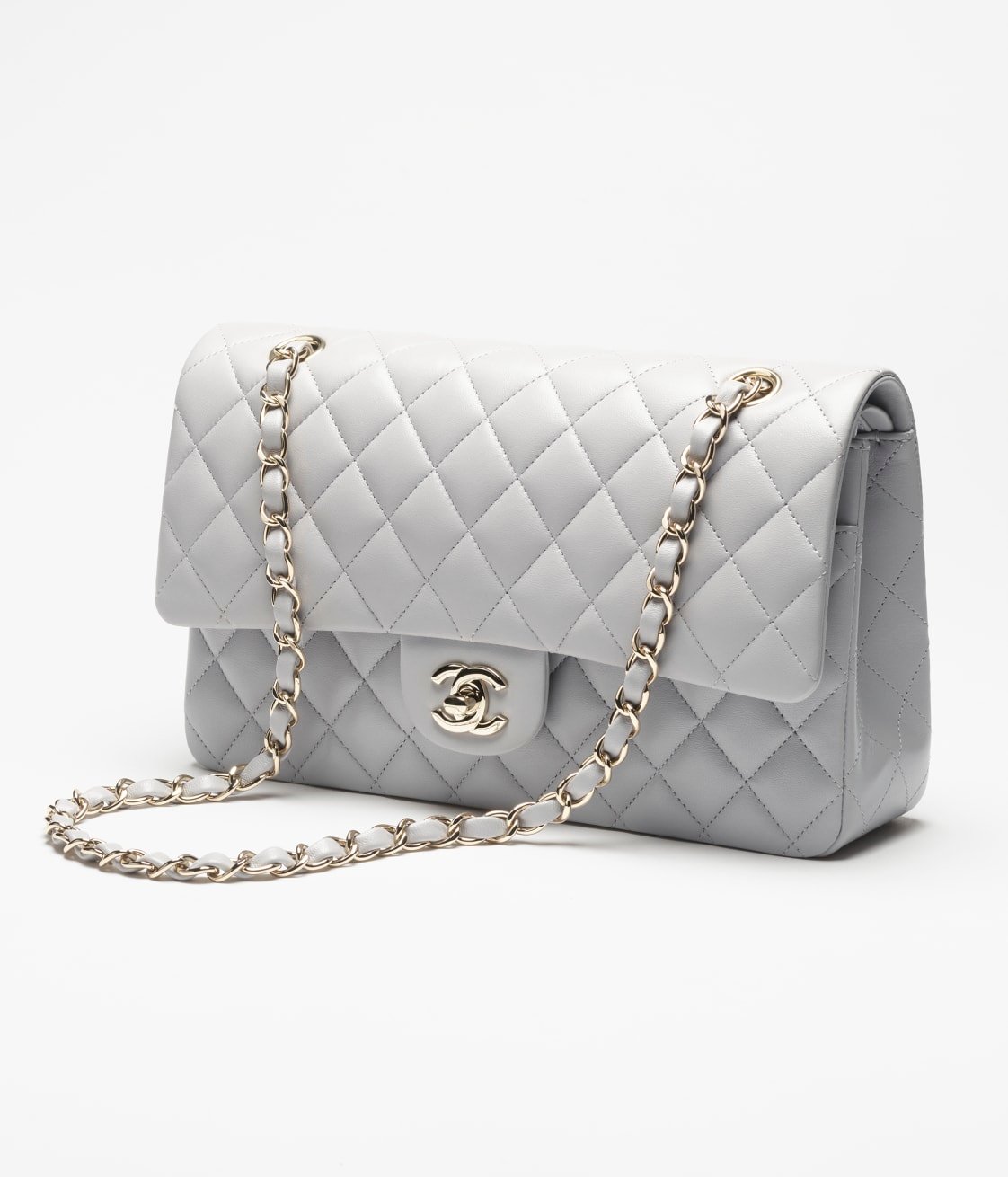 This flap bag is made of grey lambskin with gold hardware, front flap with signature CC turnlock closure, half-moon back pocket, adjustable gold interwoven chain link and grey leather shoulder strap.