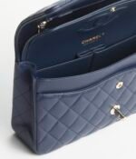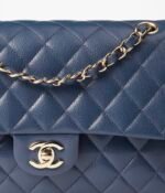 This flap bag is made of blue lambskin with gold-tone hardware, front flap with signature CC turnlock closure, half-moon back pocket, adjustable gold-tone interwoven chain link and blue leather shoulder strap.