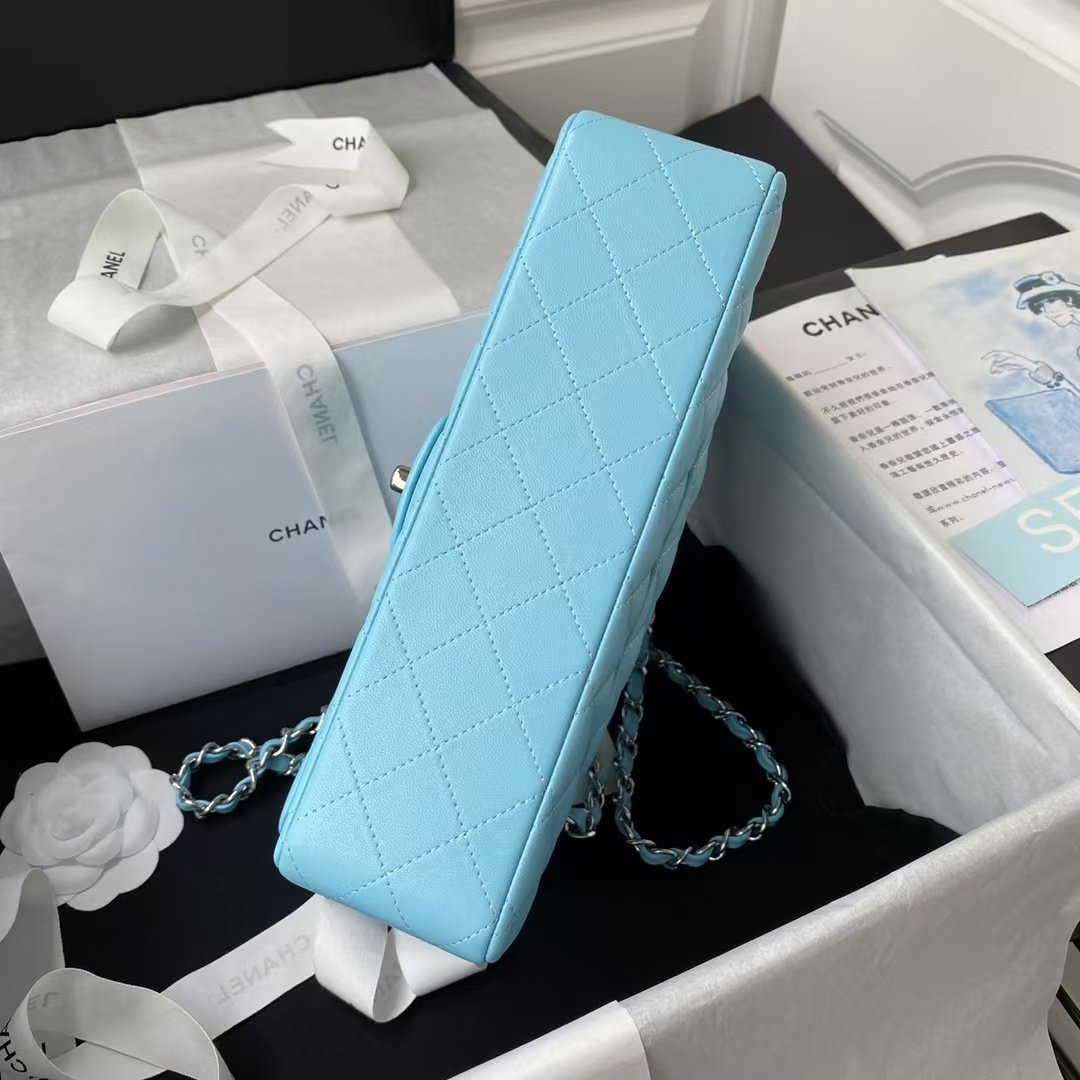 This medium classic double flap bag is crafted in light blue lambskin with silver hardware, front flap with signature CC turnlock closure, half-moon back pocket, adjustable light blue interwoven chain and light blue leather shoulder strap.