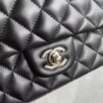 This medium classic double flap bag is crafted in black lambskin with silver-tone hardware, featuring the signature CC turnlock closure on the front flap, half-moon back pocket, adjustable interwoven silver-tone chain and black leather shoulder strap.