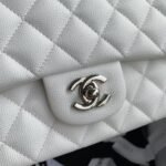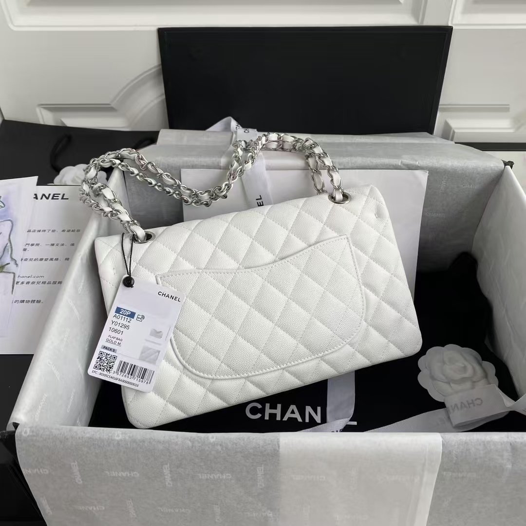 This medium classic double flap bag is crafted in white caviar leather with silver-tone hardware, featuring the signature CC turnlock closure on the front flap, half-moon back pocket, adjustable interwoven silver-tone chain and white leather shoulder strap.