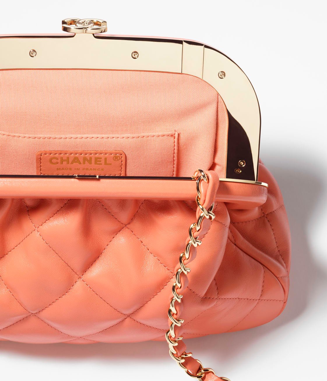 This Chanel Cloud Bag is made of coral lambskin with gold hardware, front CC logo with quilted satin, coral leather, top CC Kiss lock, interwoven gold-plated chain links and coral leather shoulder/crossbody strap