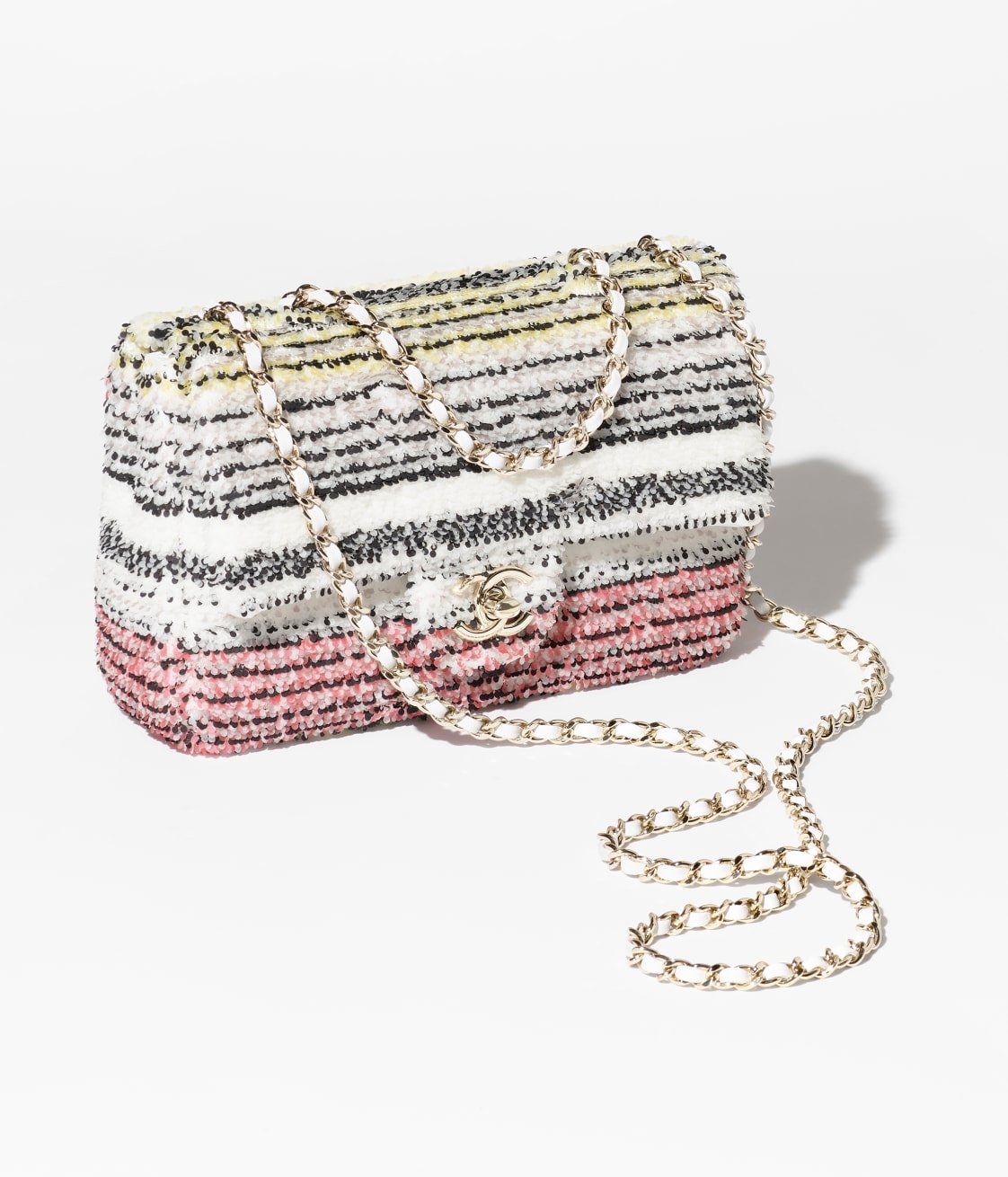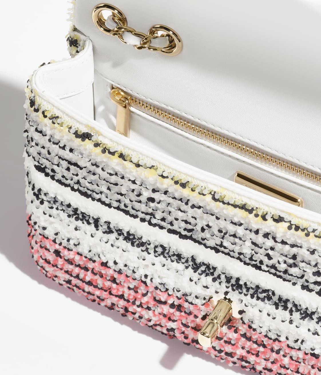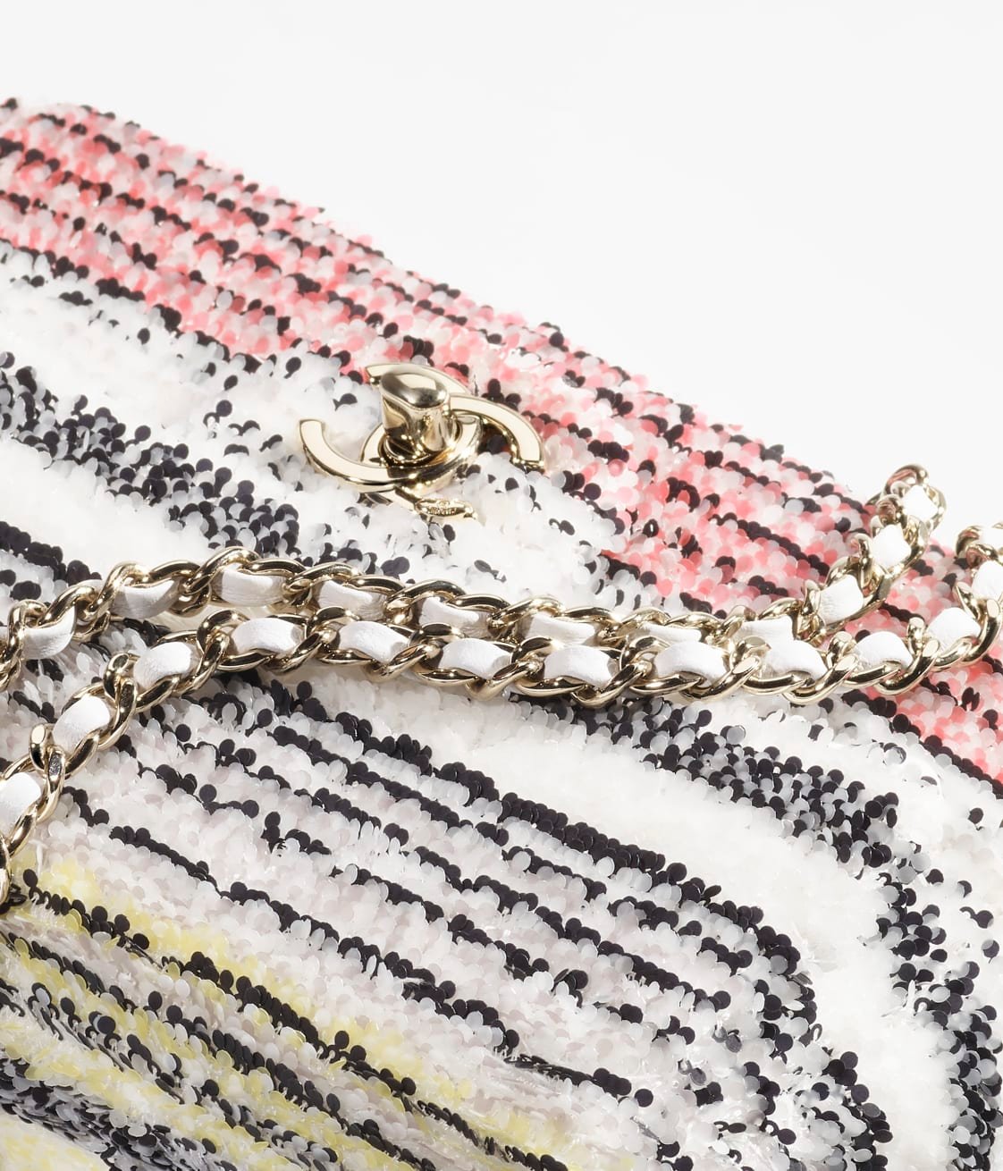 This Chanel mini striped flap bag is of black, white, pink and yellow sequins with light gold hardware and features a front CC turnlock closure, tonal stitching, and one interwoven white leather and light gold chain shoulder/crossbody strap.
