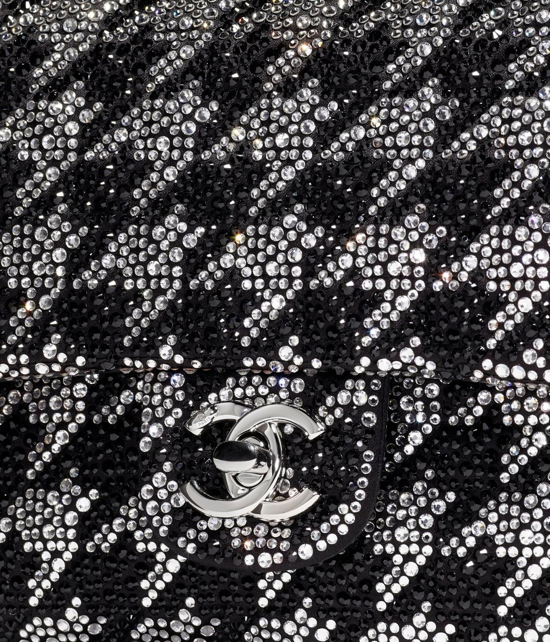 This flap bag is crafted with black and white crystal inlays and features silver-tone hardware. It has a front flap with the signature CC turnlock closure, and an interwoven black leather and silver-tone chain link shoulder/crossbody strap.
