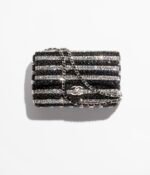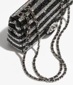 This flap bag is embellished with black and white crystals and features silver-tone hardware. It has a front flap with the signature CC turnlock closure, and an interwoven black leather and silver-tone chain link shoulder/crossbody strap.