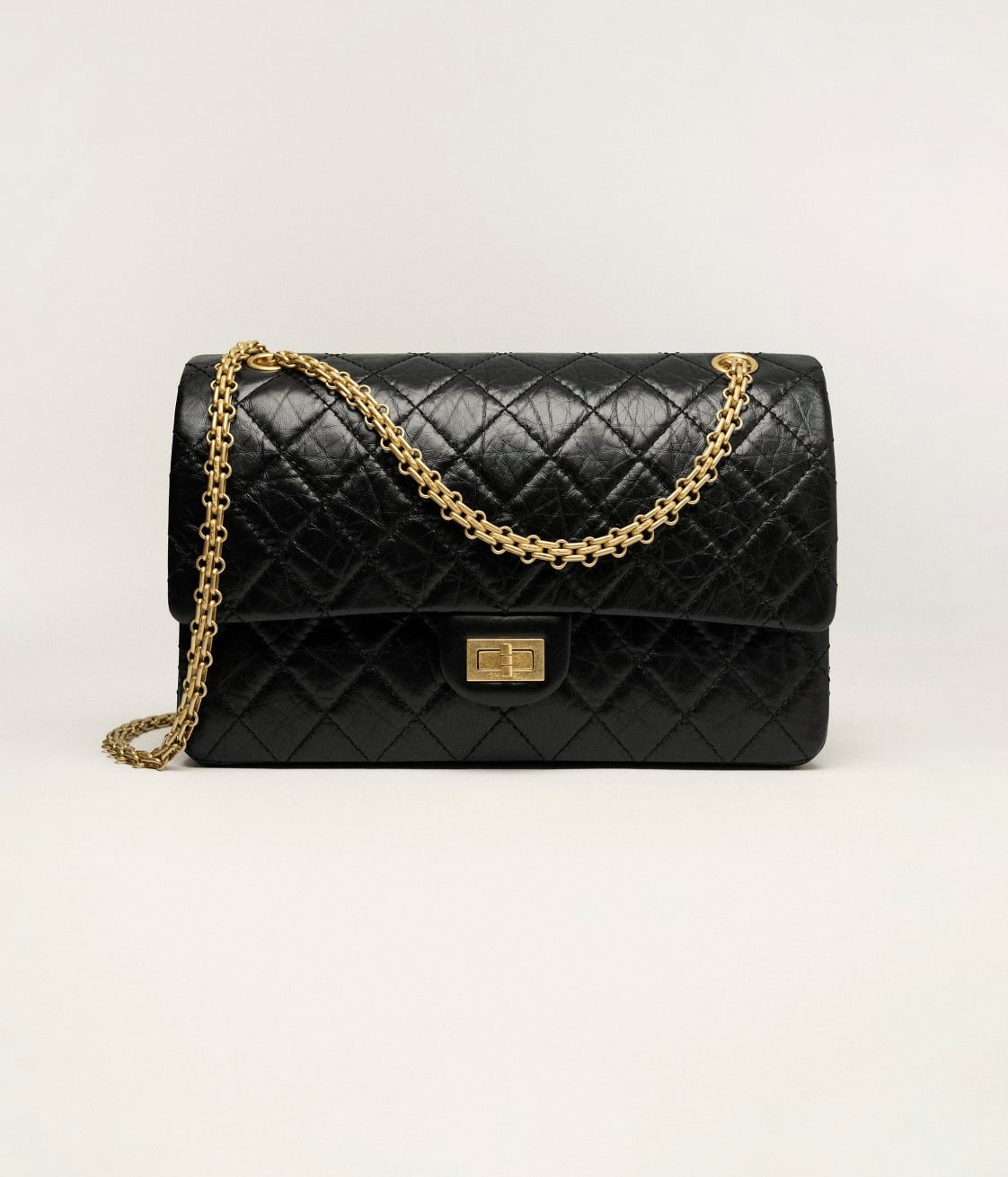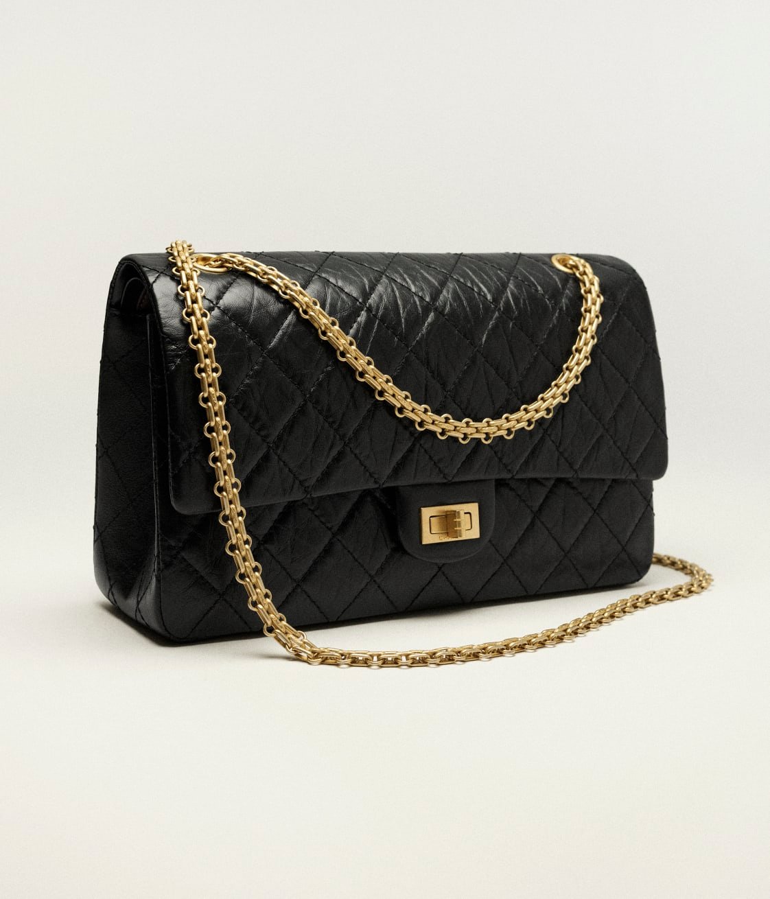 This large Reissue 2.55 single flap bag is crafted from distressed black calfskin with antique gold hardware, a front flap with a Mademoiselle turnlock closure, half-moon back pockets and interwoven gold-tone links.