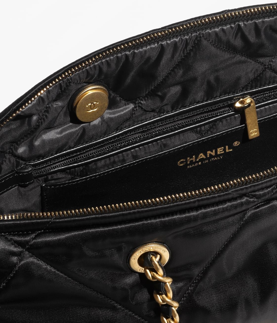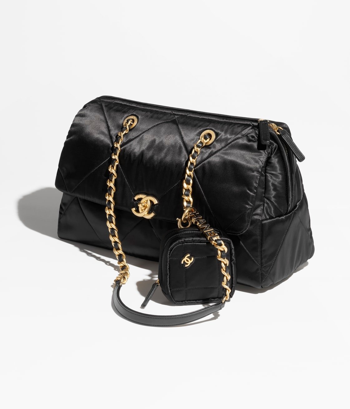 This travel bag is crafted from black velvet with antique gold hardware and features signature diamond quilting, signature CC turnlock closure, and zip fastening.