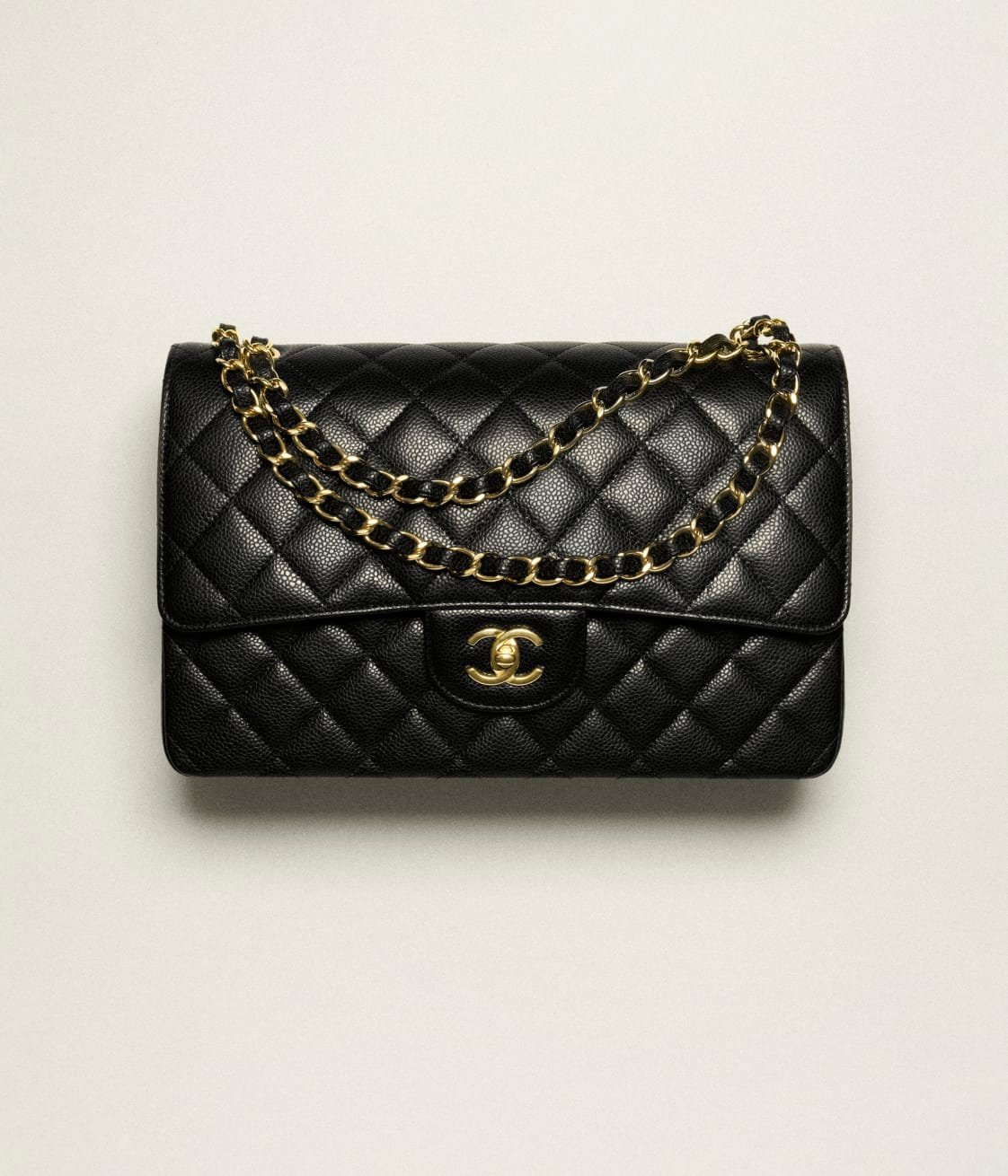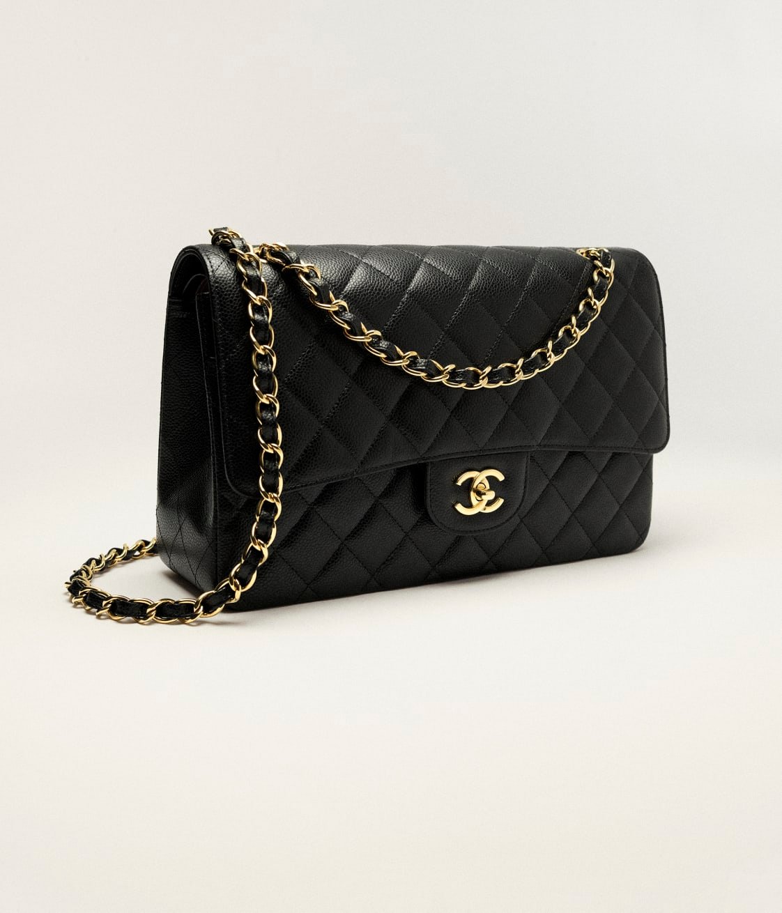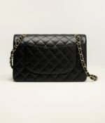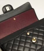 This large classic double flap bag is crafted in black lambskin leather with gold-tone hardware, front flap with signature CC turnlock closure, half-moon back pocket, adjustable gold-tone interwoven chain link and black leather shoulder strap.