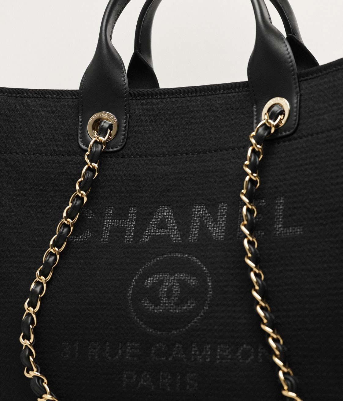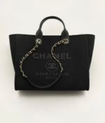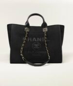 This shopping bag is made of black canvas with light gold hardware, large CC logo and Chanel logo on the front, removable pouch, interwoven light gold chain links and black leather shoulder strap.