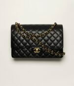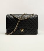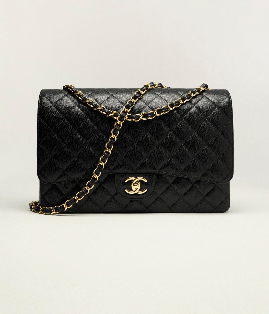This Oversized classic double flap bag in black caviar leather with gold hardware, front flap with signature CC turnlock closure, half-moon back pocket, adjustable gold interwoven chain link and black leather shoulder strap.