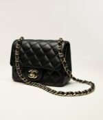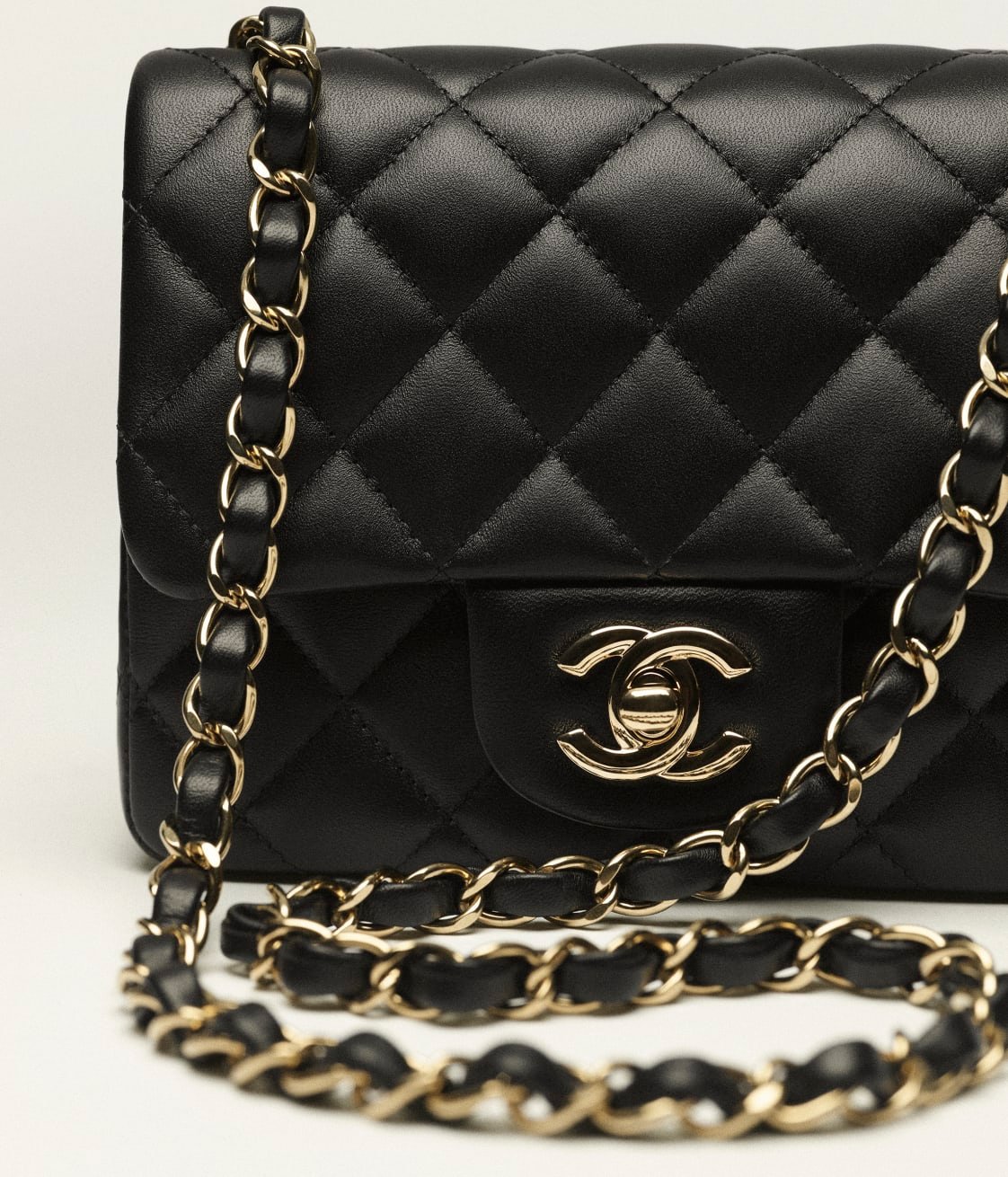 This Chanel Classic Mini Square flap bag is in black lambskin leather with light gold tone hardware and has a front flap with signature CC turnlock closure, tonal stitching, rear half moon pocket and single interwoven black leather and light gold tone chain link shoulder/crossbody strap.