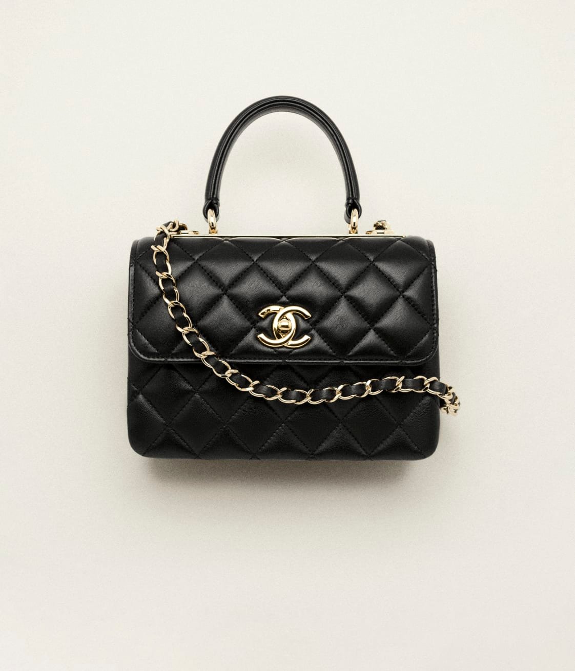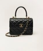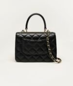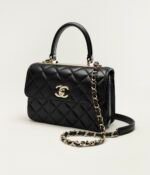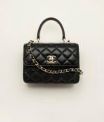 This mini rectangular flap bag features a top handle and is made of black lambskin with gold hardware, front flap with CC turnlock closure, half-moon back pocket, top handle and black leather shoulder/crossbody strap.