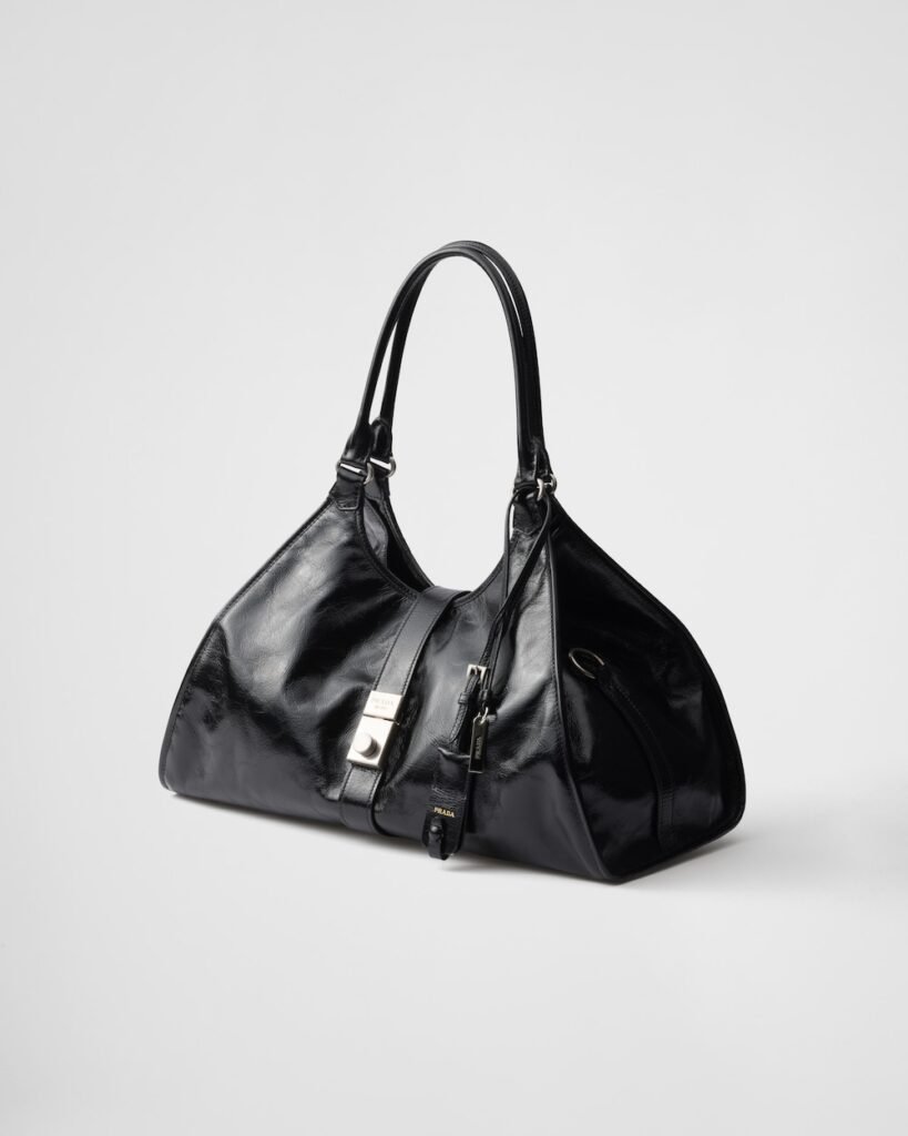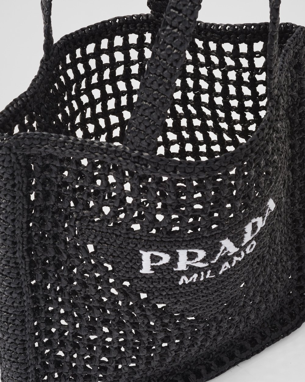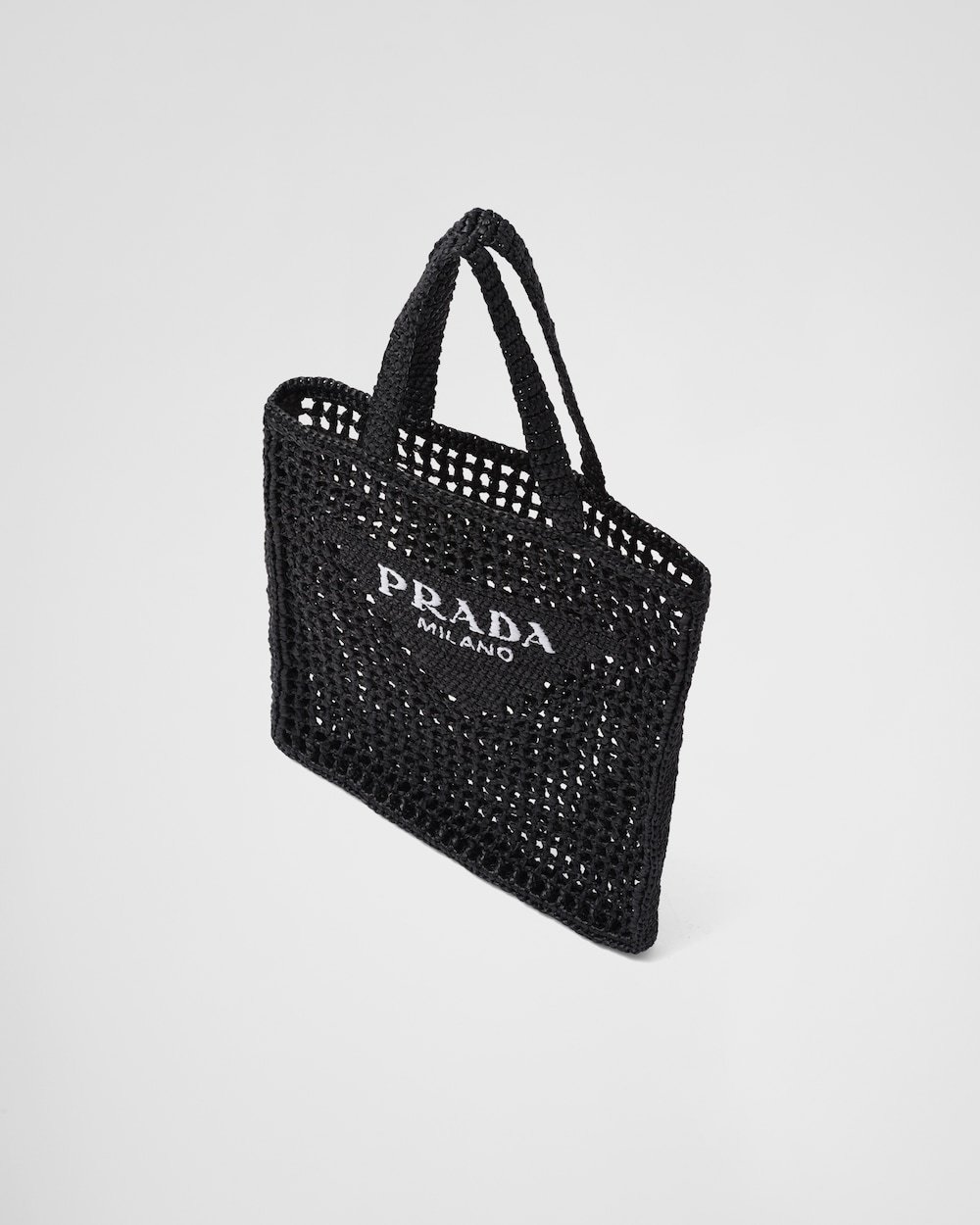 This crochet tote bag with a soft, deconstructed design boasts a light and summery mood. A new interpretation of Prada’s emblematic triangle decorates the front and is embellished at its center with the embroidered lettering logo.