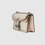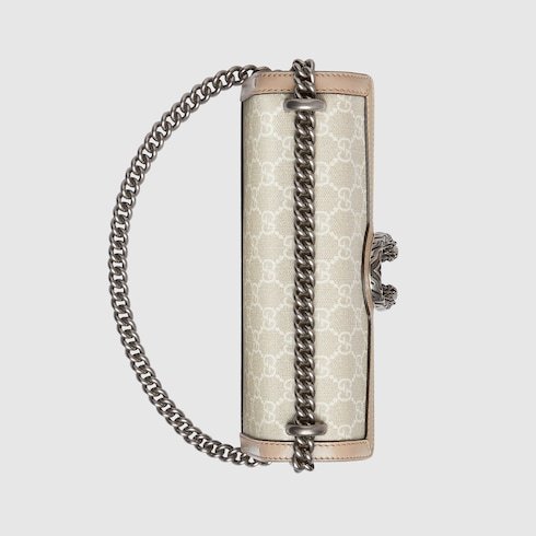 A heritage material from the archive, GG Supreme has been reimagined in Gucci Love Parade in different color combinations and combined with contemporary as well as classic styles. The Dionysus is presented in a beige and white variation of the signature material with a tonal trim. Originally a play on a ’30s design, the canvas speaks to the historical narrative that runs throughout the collection.