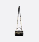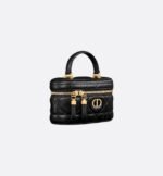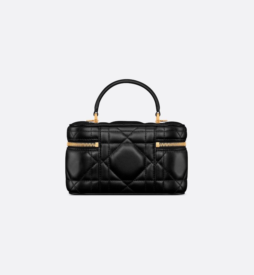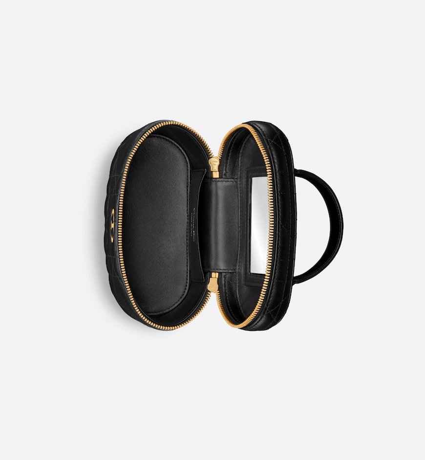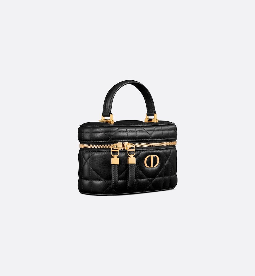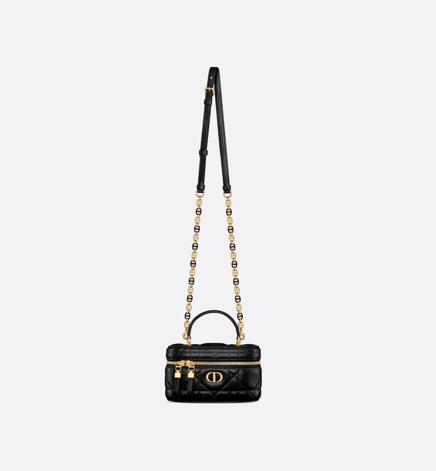 New for Summer 2024, the Dior Caro mini vanity case enhances the line with a compact design that is both functional and refined. Crafted in black lambskin, it stands out with the original quilted effect of the Macrocannage stitching, as well as a CD signature on the front. The vanity case will accommodate the essentials and is completed by a pocket and interior mirror. It can be carried by hand using the handle or worn over the shoulder or crossbody using the adjustable and removable chain strap featuring alternating gold-finish metal and black enamel links with a leather insert.