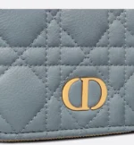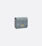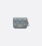 The Dior Caro Scarlet wallet features an elegant CD signature on its flap and hallmark Cannage topstitching. Crafted in cloud blue supple calfskin, the lightweight and practical daily essential can be combined with other pieces from the Dior Caro line and may be slipped into any bag.