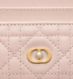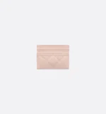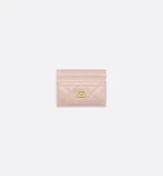 The Dior Jolie Freesia card holder is an elegant accessory from the House’s new line. Constructed in powder pink lambskin with Cannage stitching, it is accented by the CD signature embellished with a resin pearl. Featuring five card slots, the refined accessory will fit anywhere and can be paired with other Dior Jolie creations.