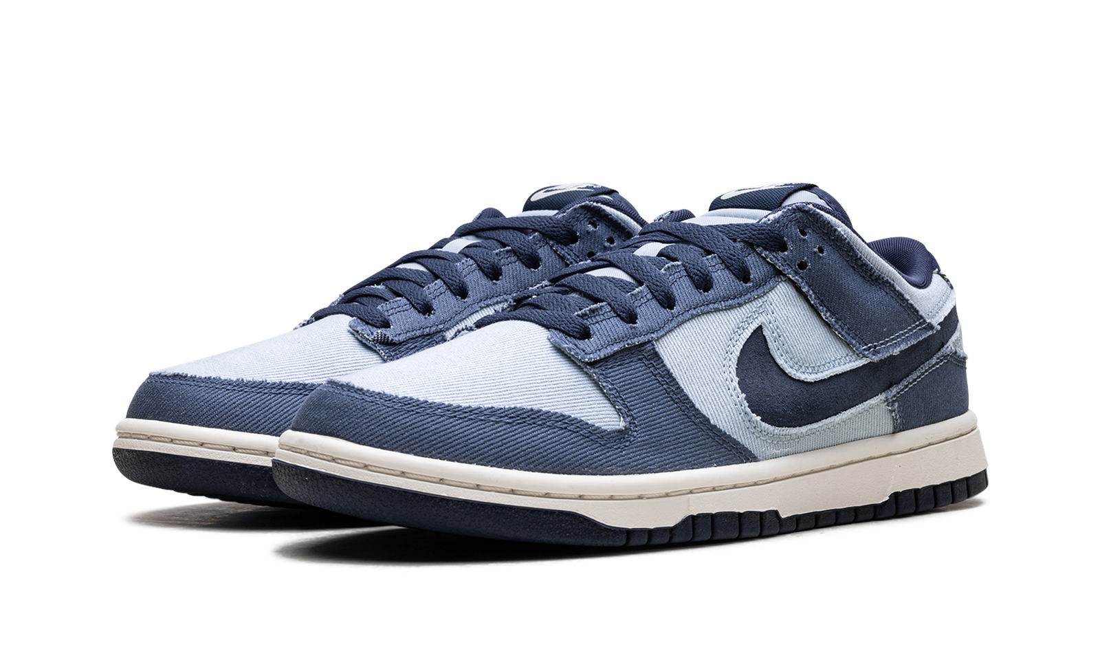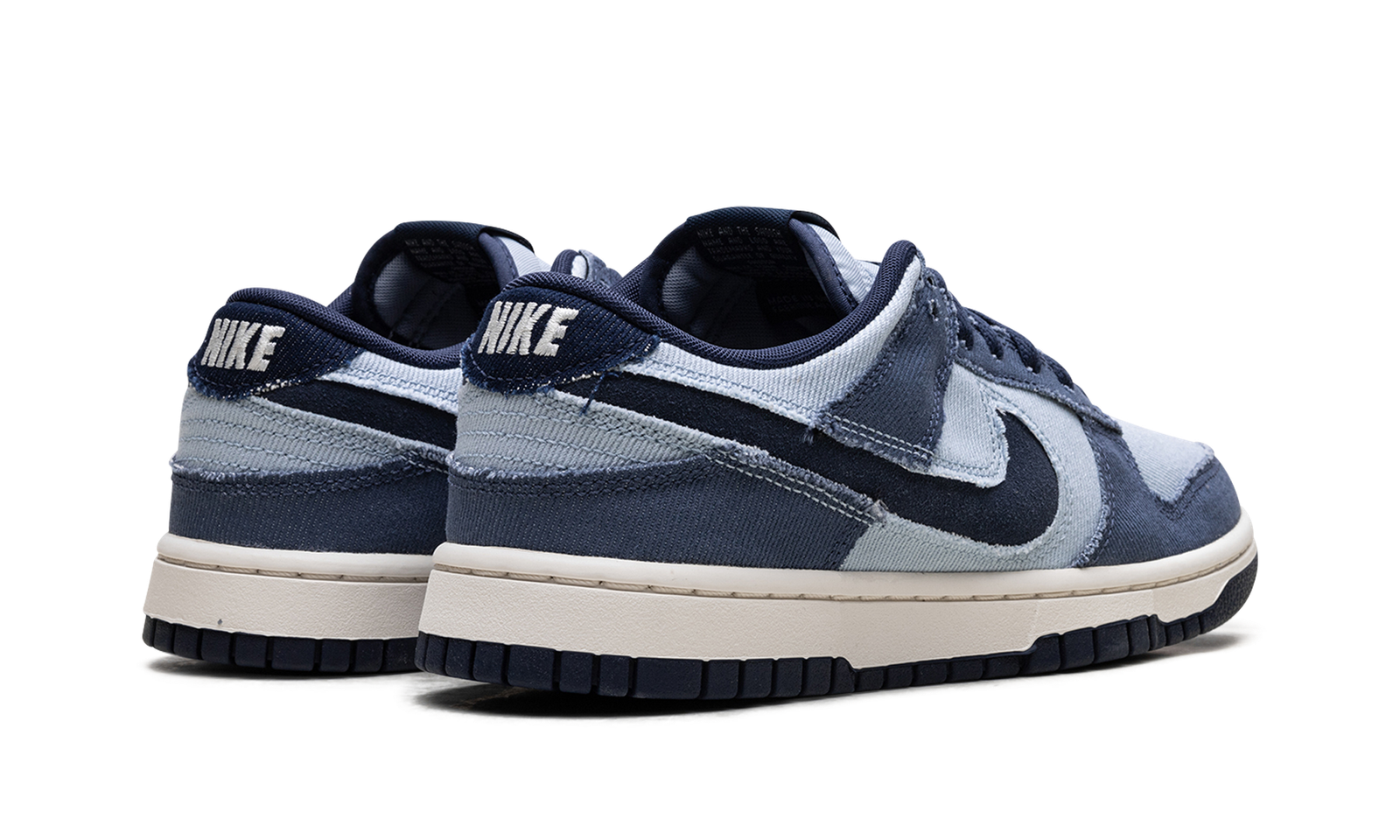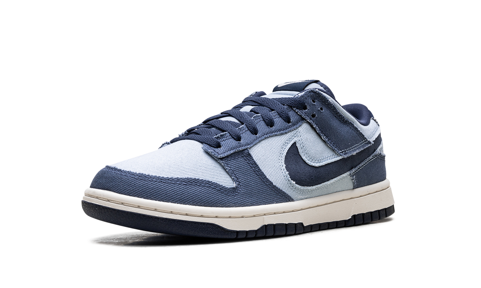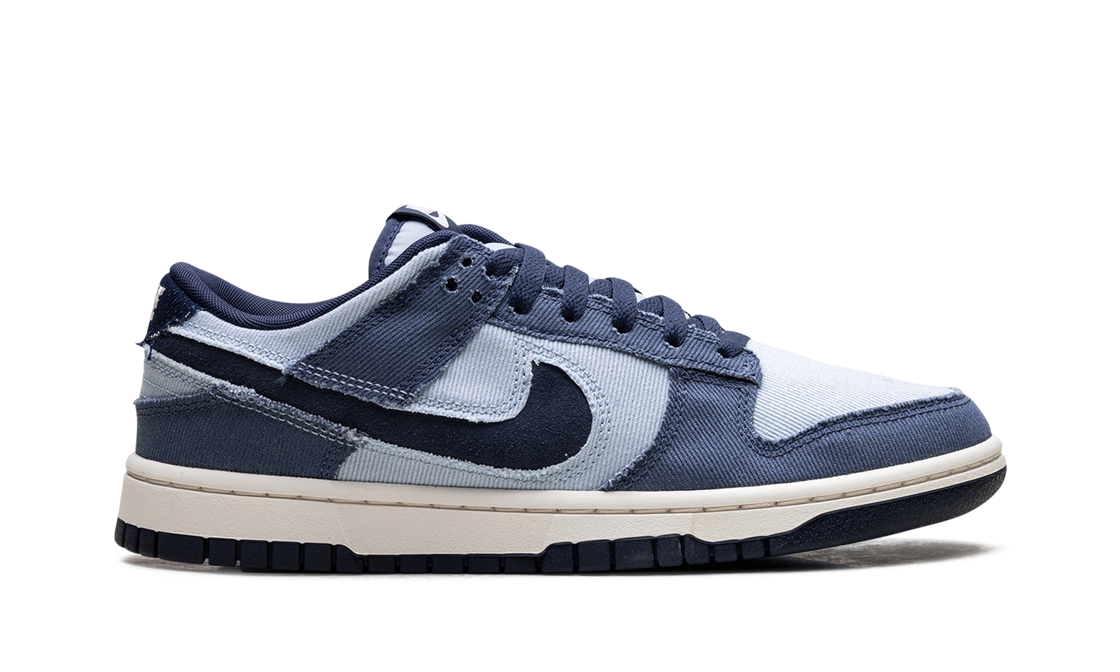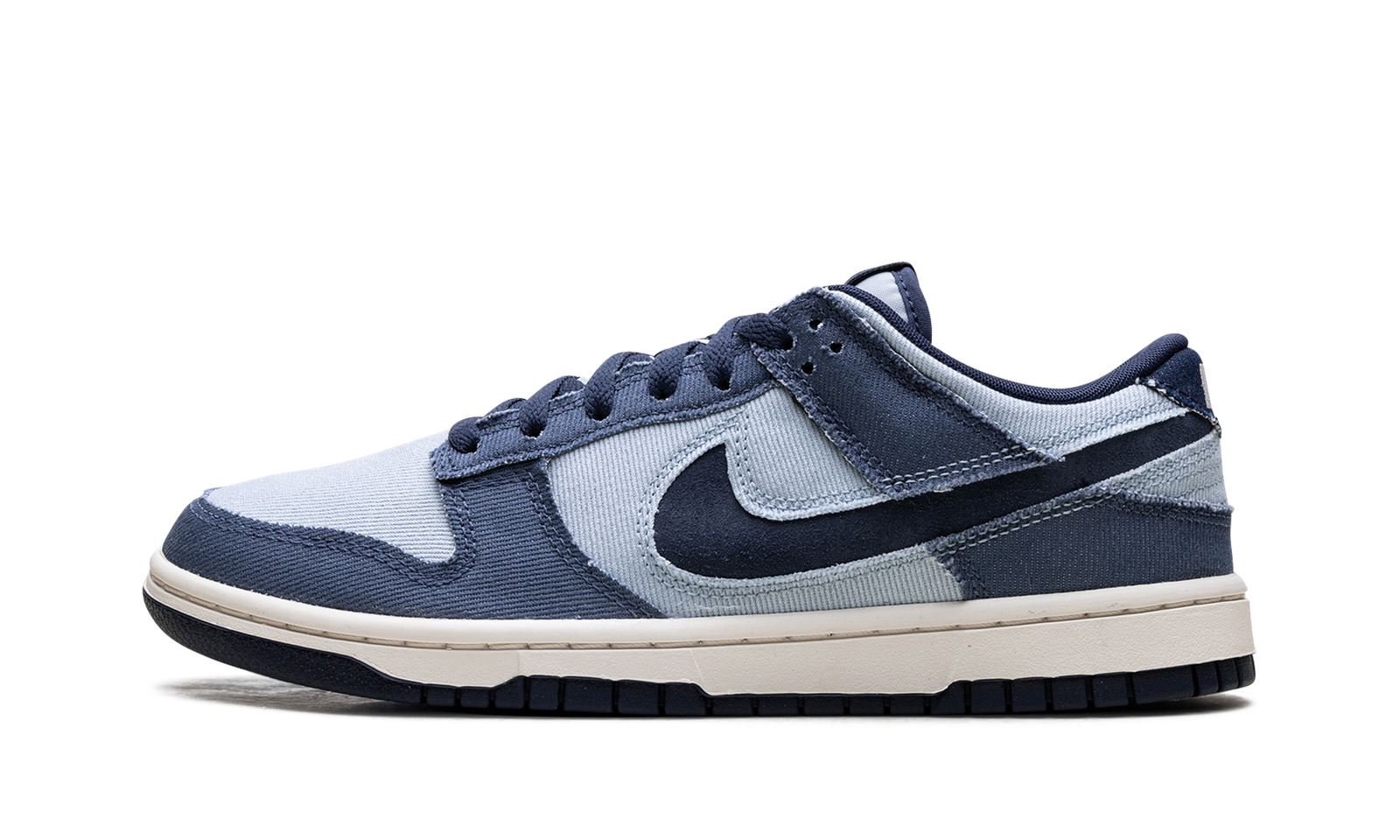 The Nike Dunk Low Light Armory Blue Denim is a low top sneaker featuring an upper crafted in multiple shades of Blue Denim. The Light Armory Blue base is overlaid by Diffused Blue, while the Swoosh pops in Midnight Navy. The Pale Ivory midsole meets a black outsole, and Nike branding on the tongue and rear heel tab finish the look.