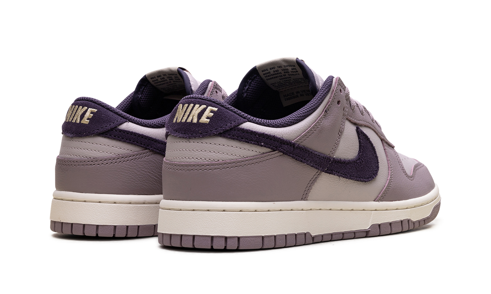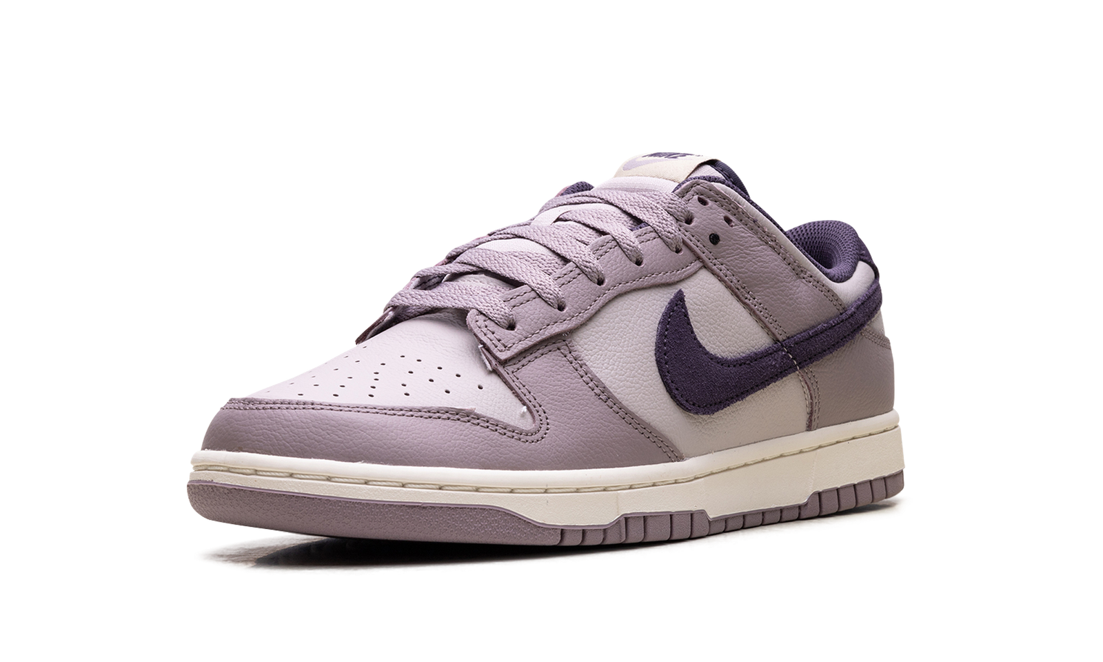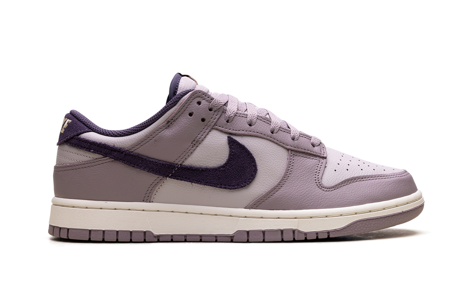 Made with tumbled leather, the Nike Dunk Low SE ‘Light Violet Ore’ sports two shades of lavender with dark violet, decorating the collar lining, suede back tab and the Swoosh on the side.