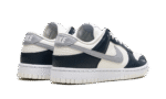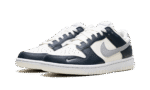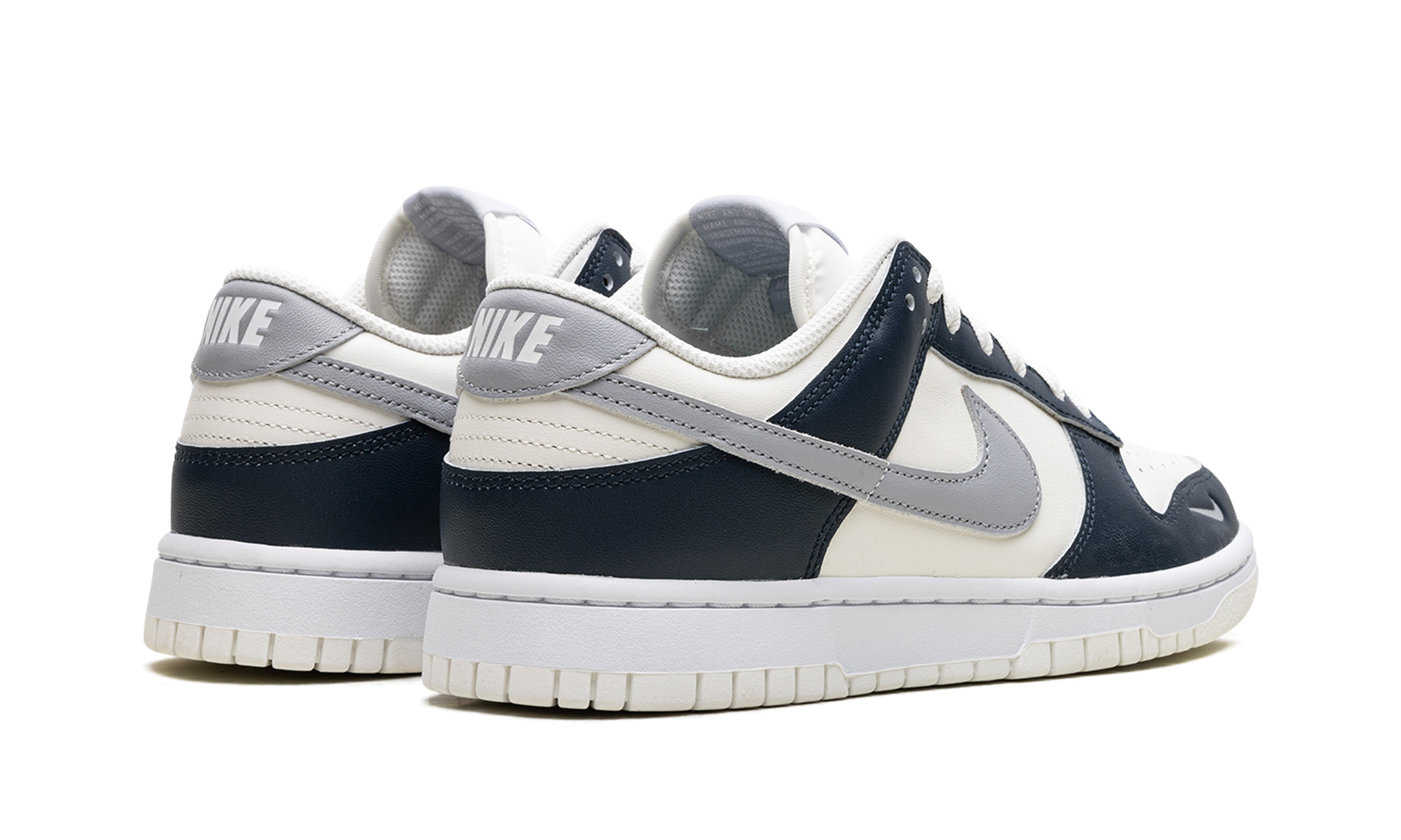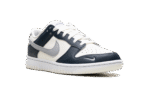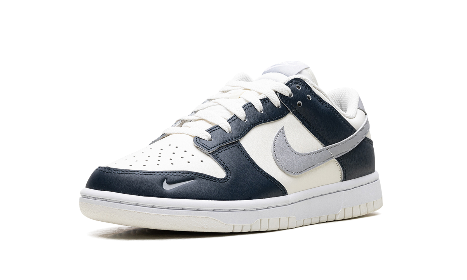 The Nike Women’s Dunk Low ‘Sail Armory Navy’ features a grey Swoosh on an off-white leather upper. Contrasting navy leather overlays reinforce the forefoot and heel.