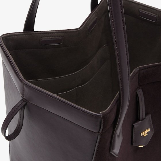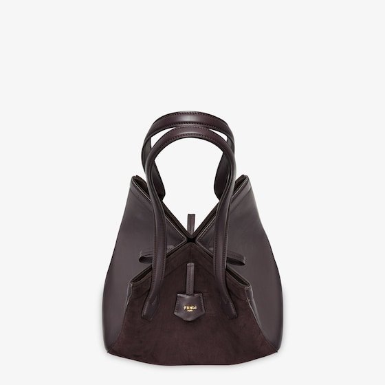 Medium Origami Bag. The style recalls the duality and creativity of Fendi with an innovative and transformable design:the ingenious closure with eight magnets means the bag can be folded, origami-style, transforming it from a bucket bag, when the magnets come together in the middle with a magic clasp, into a shopper by gently pulling the leather ties on the short shoulder straps on each side.