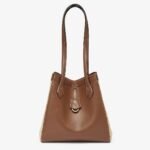 It can be carried by hand or worn on the shoulder thanks to two brown leather handles.