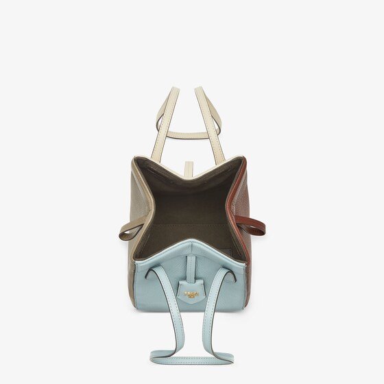 Mini Origami Bag. The style recalls the duality and creativity of Fendi with an innovative and transformable design:the ingenious closure with eight magnets means the bag can be folded, origami-style, transforming it from a bucket bag, when the magnets come together in the middle with a magic clasp, into a shopper by gently pulling the leather ties on the short shoulder straps on each side.