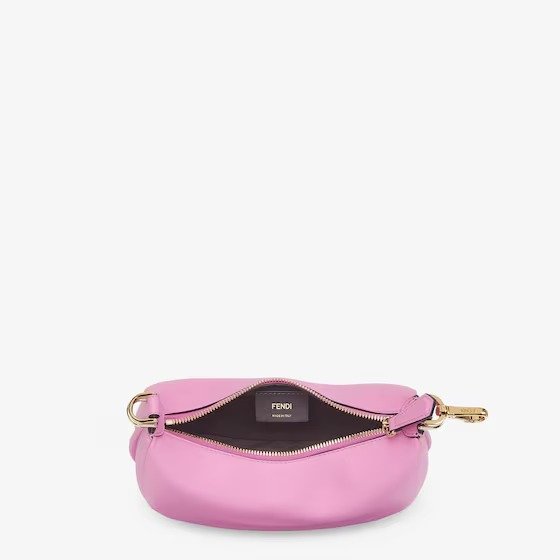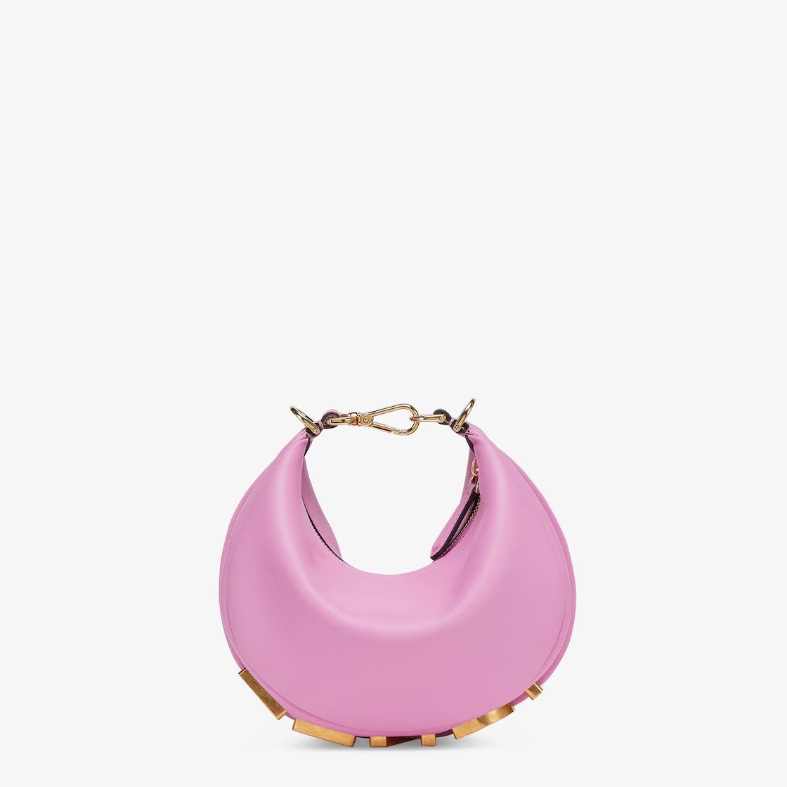 Mini hobo bag, part of the collection curated with designer Stefano Pilati, made of soft pink leather, embellished with vintage gold metal FENDI lettering.