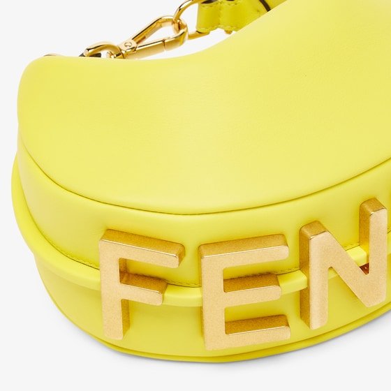 Mini hobo bag made of soft, acid yellow leather, embellished with vintage gold metal FENDI lettering.