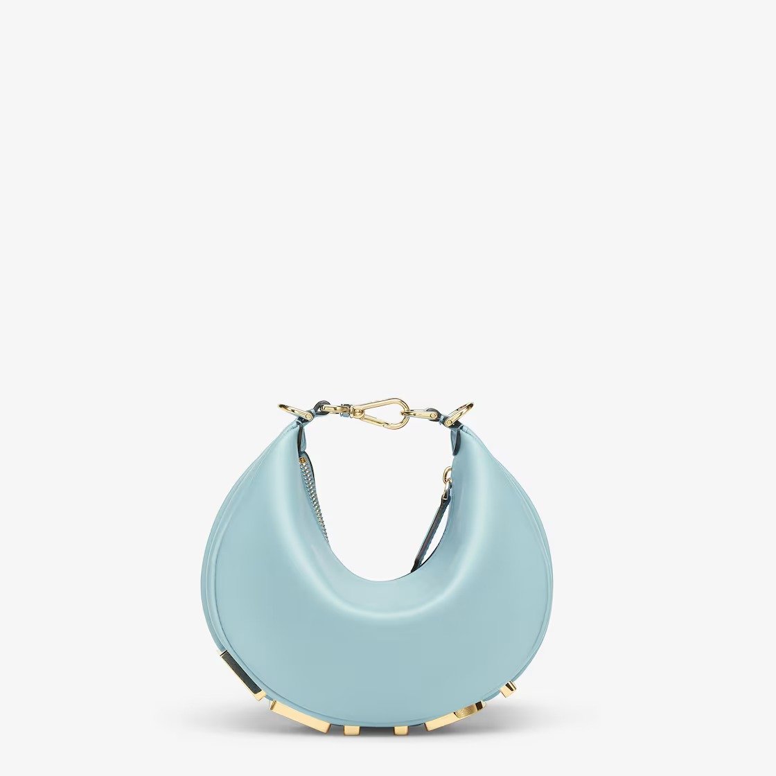 Made of light blue calfskin, decorated with vintage gold-finish metal FENDI lettering on the base, visible when the bag is worn.